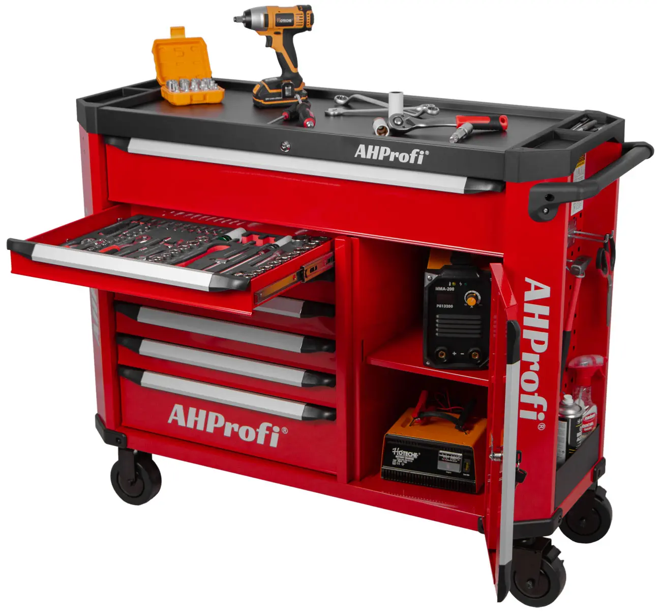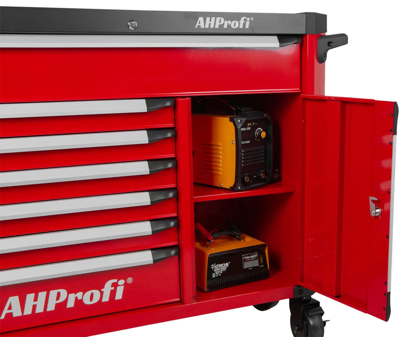 Samotný vozík je doplnený o veľkú hornú oceľovú dosku, ktorú možno využiť pri práci ako odkladaciu plochu.