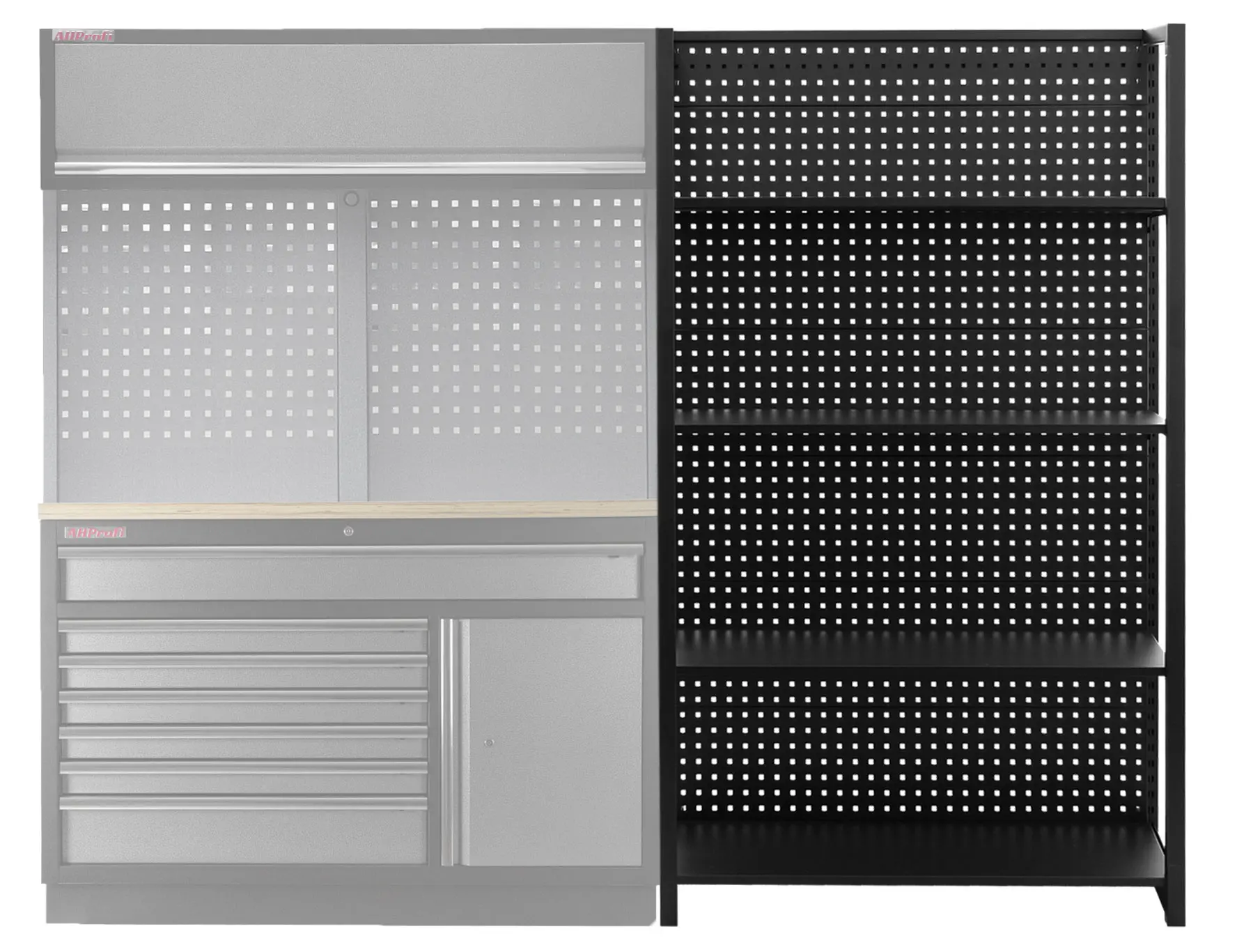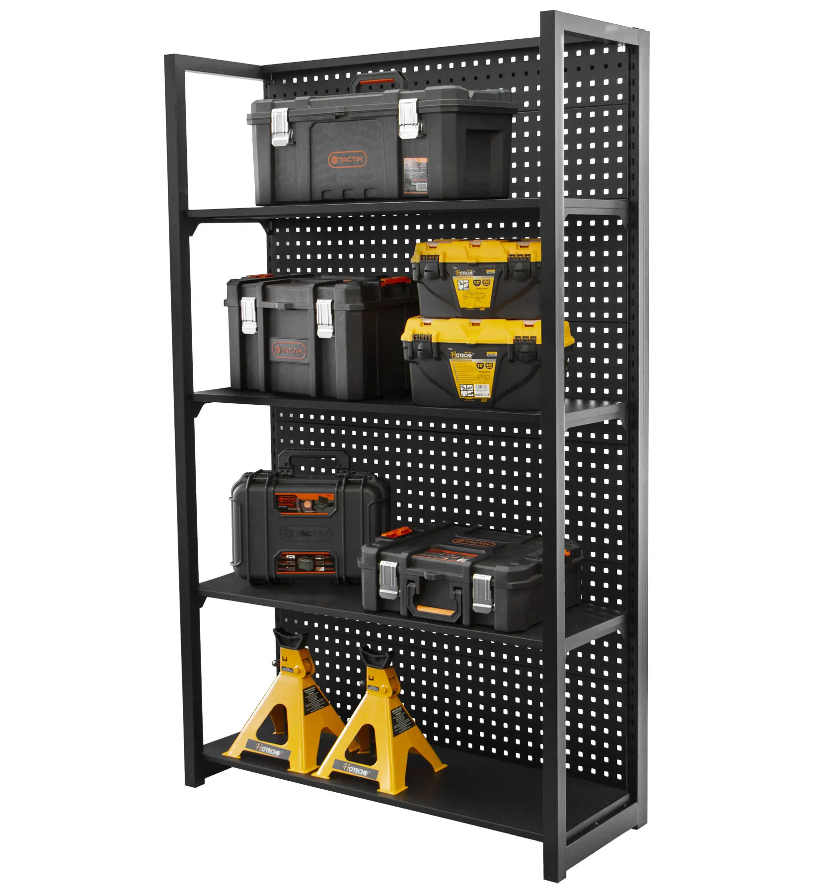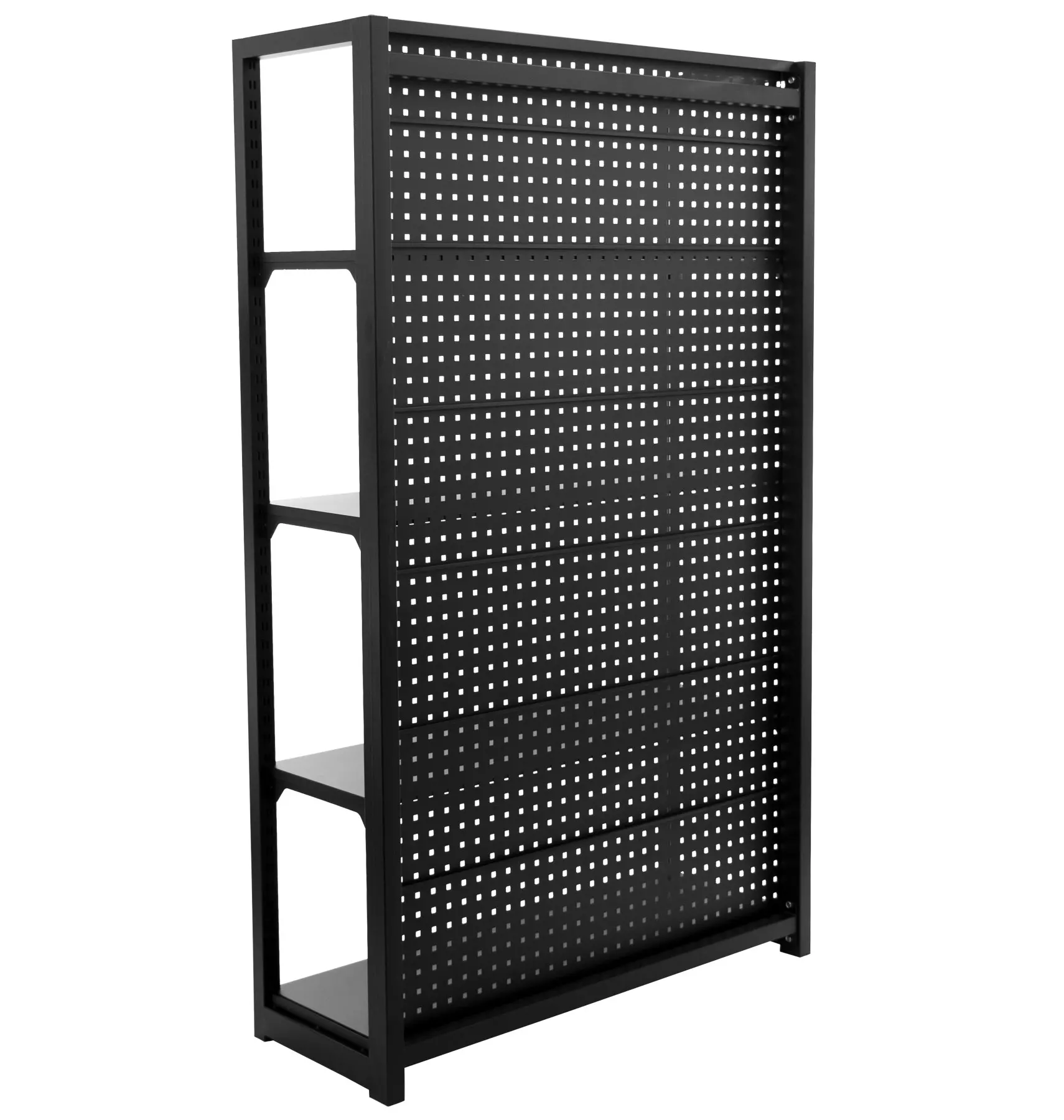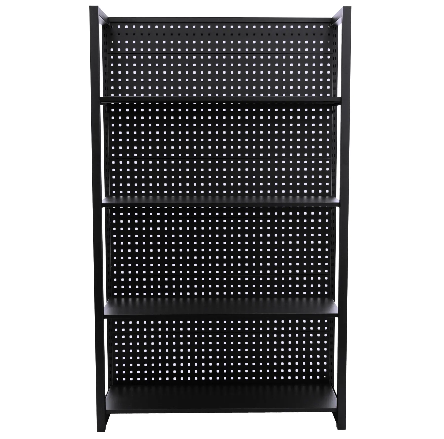 Stabilitu regálu zaisťujú dve bočnice a zadná dierovaná doska, ktorú je možné tiež využiť pre zavesenie drobného náraia pomocou háčikov (háčiky niesú súčasťou balenia).