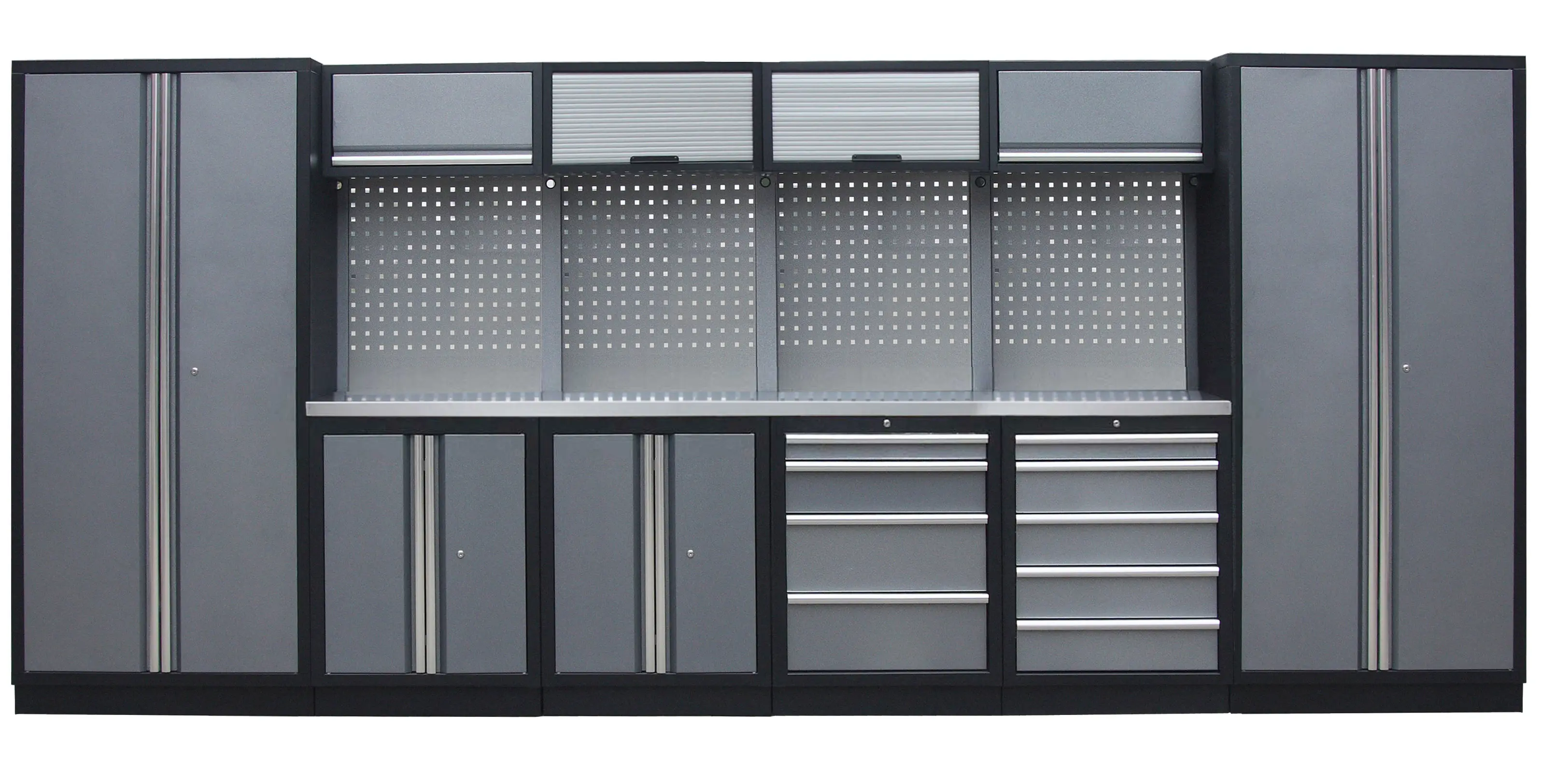 Dielenský nábytok PROFI GREY s nerezovou doskou zaujme moderným a profesionálnym vzhľadom. Kombinácia kladívkovo sivej RAL 3031 a čiernej RAL 9004 sa bude vynímať v každej garáži aj dielni. Zostava nábytku v sebe skrýva dostatočné množstvo úložného priestoru pre vaše náradie, autotechniku aj dielenské vybavenie. V kombinácii s robustnou pracovnou doskou získate multifunkčnú stenu, s ktorou vám pôjde práca od ruky vo všetkých smeroch. Jednotlivé komponenty sú plne konfigurovateľné, zostavu je možné podľa vašich potrieb rozšíriť o ďalšie skrine, regály aj ponk.Zostava nábytku TGS1300BB1