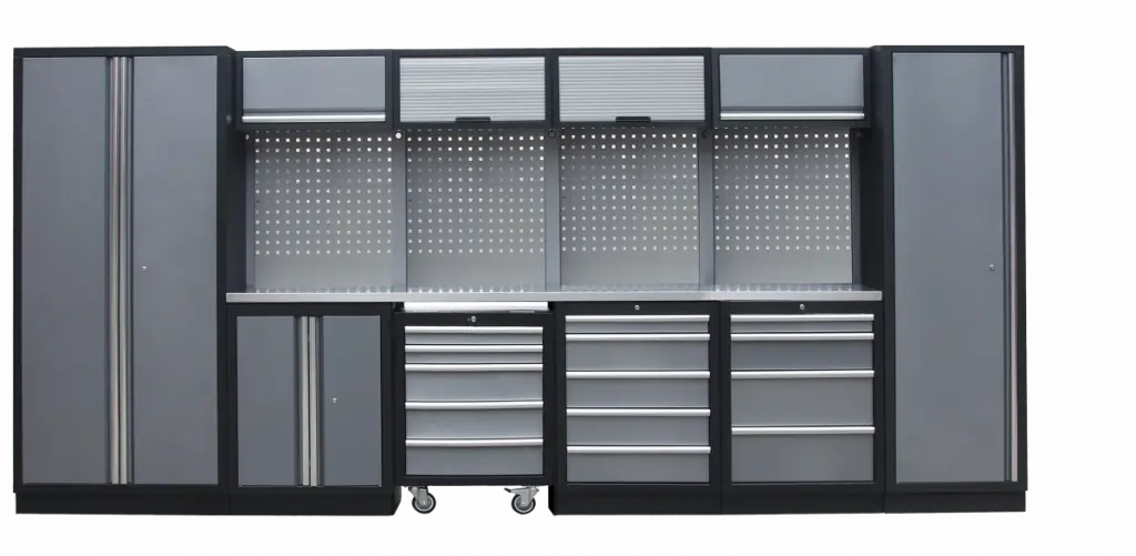 Zostava dielenského nábytku vo vysokej kvalite, ktorý je vhodný pre profesionálne servisy i domáce garáže a dielne. Nábytok je celokovový s kovovou pracovnou doskou. Zostava 21 ks dielenského nábytku udrží náradie prehľadne upratané na správnom mieste.