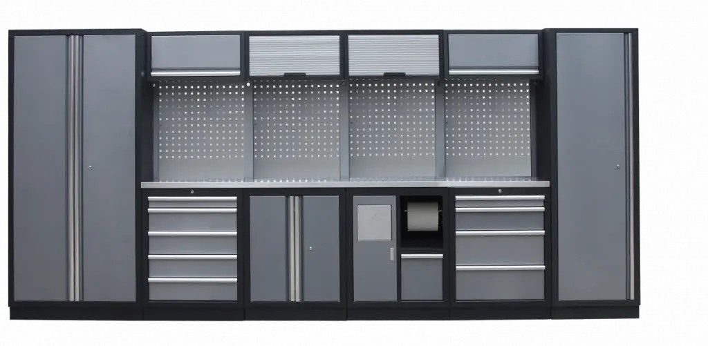 Zostava 21 ks dielenského nábytku PROFI GREY s nerezovou pracovnou doskou