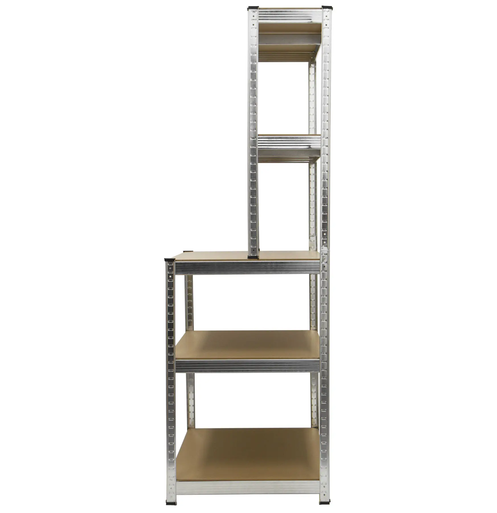 Tento regál je rozdelený na 2 časti: spodná časť s výškou 900 mm slúži ako stabilná pracovná plocha, zatiaľ čo horná časť poskytuje 3 ďalšie police na náradie, materiál alebo iné pomôcky.
