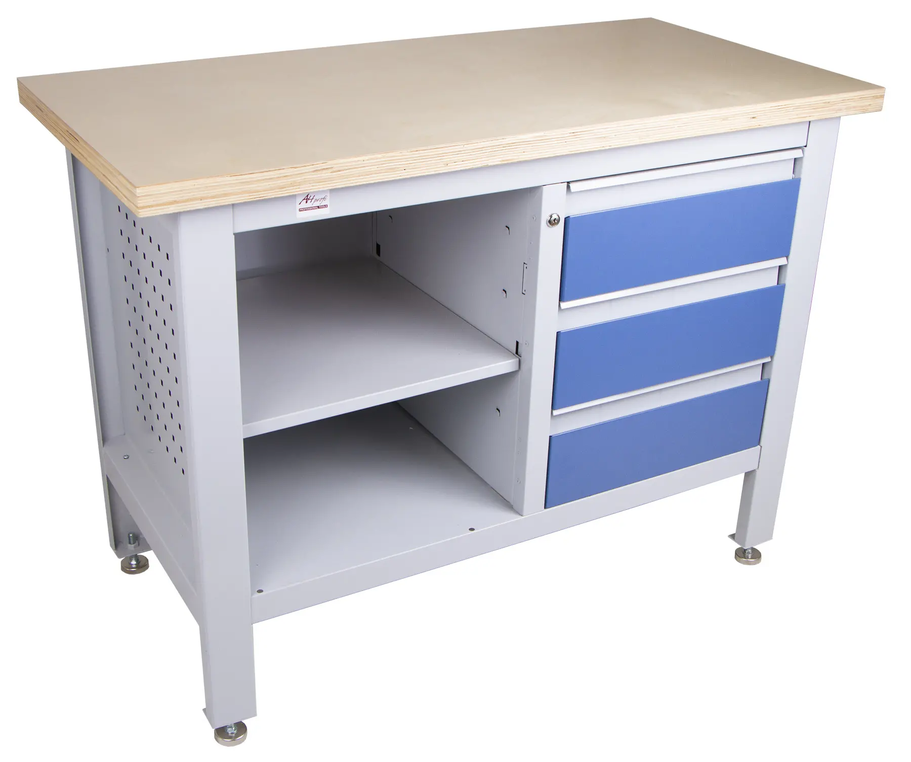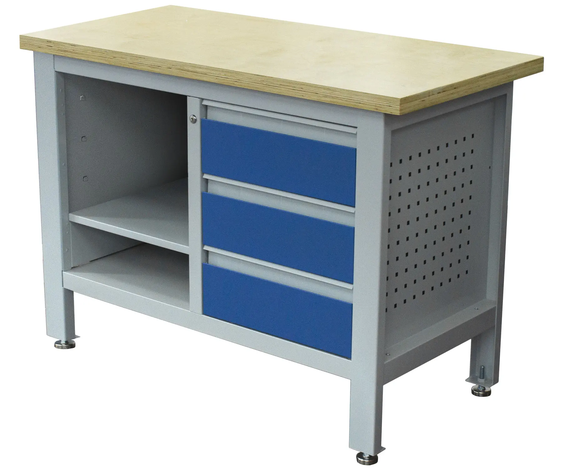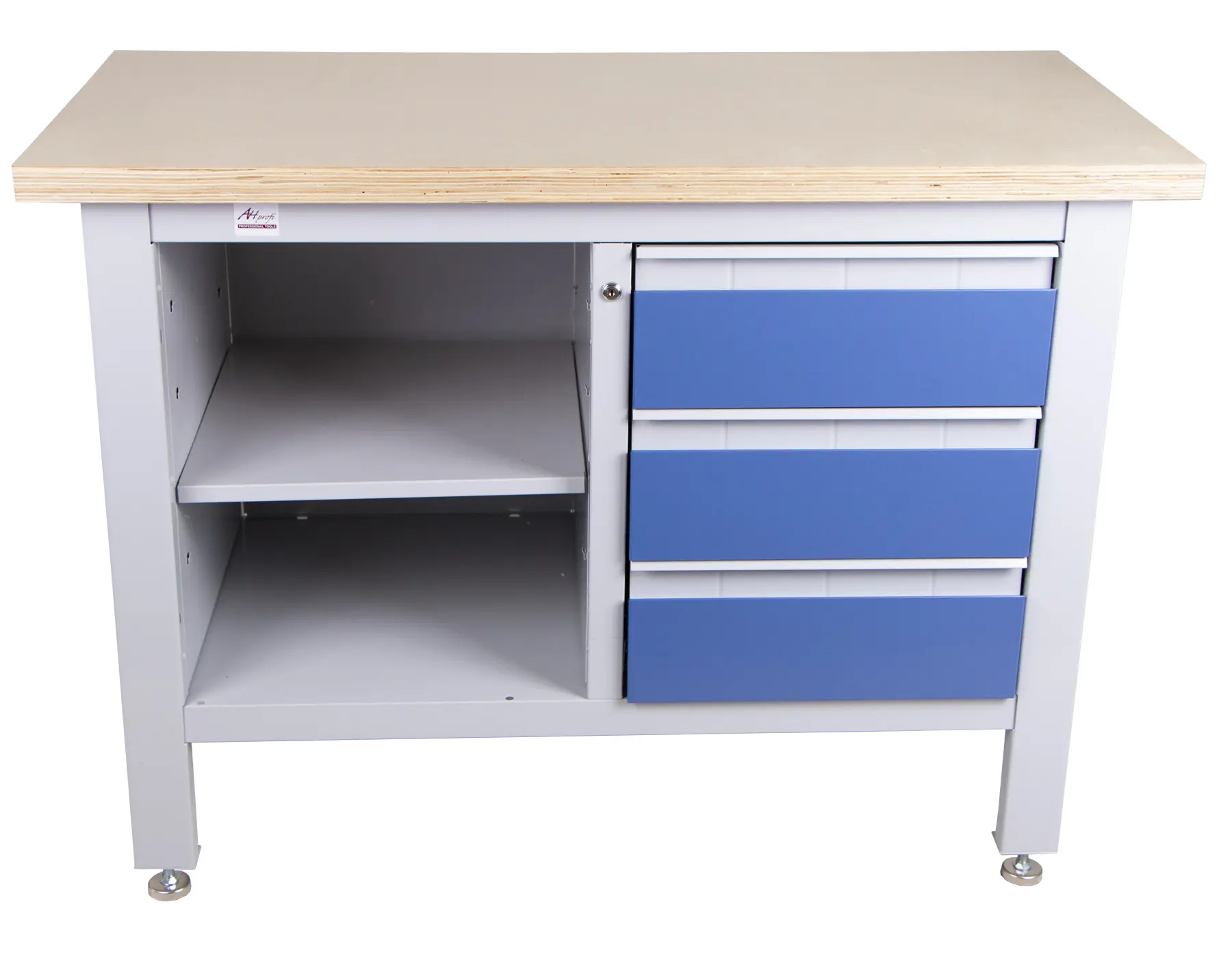 Profesionálny kovový pracovný stôl s tromi zásuvkami a policou, pracovnou doskou z masívneho drev...