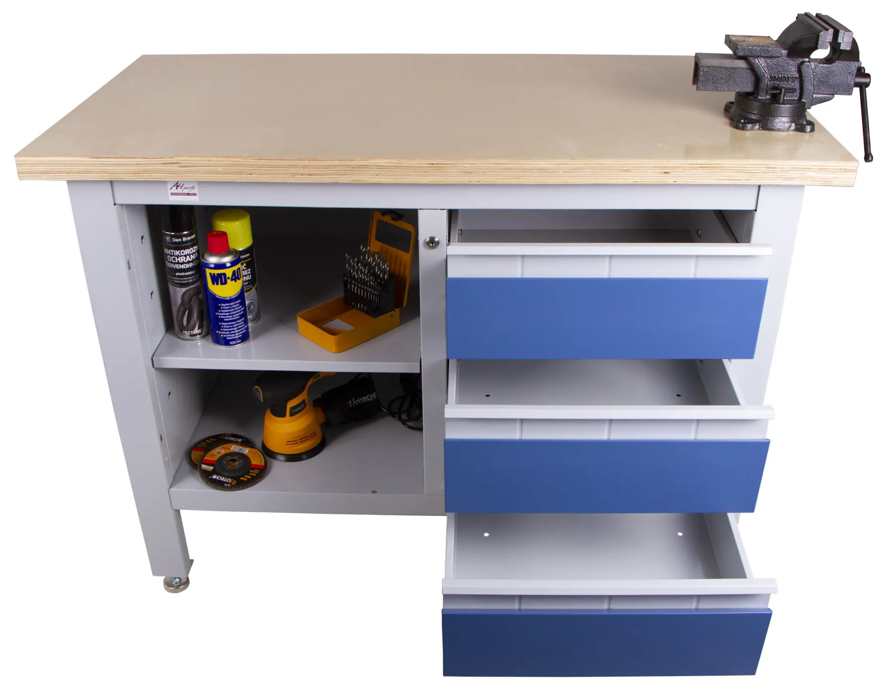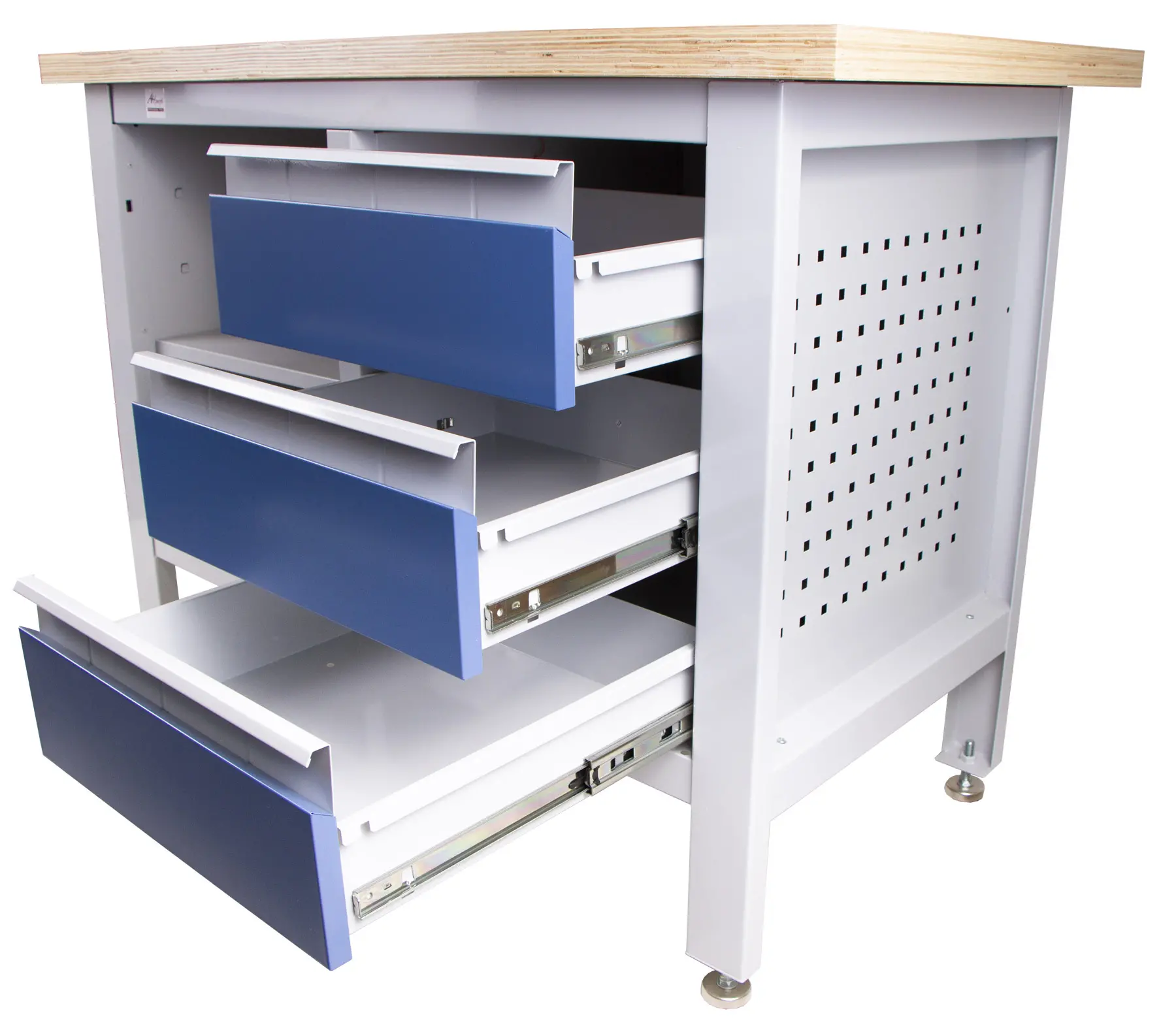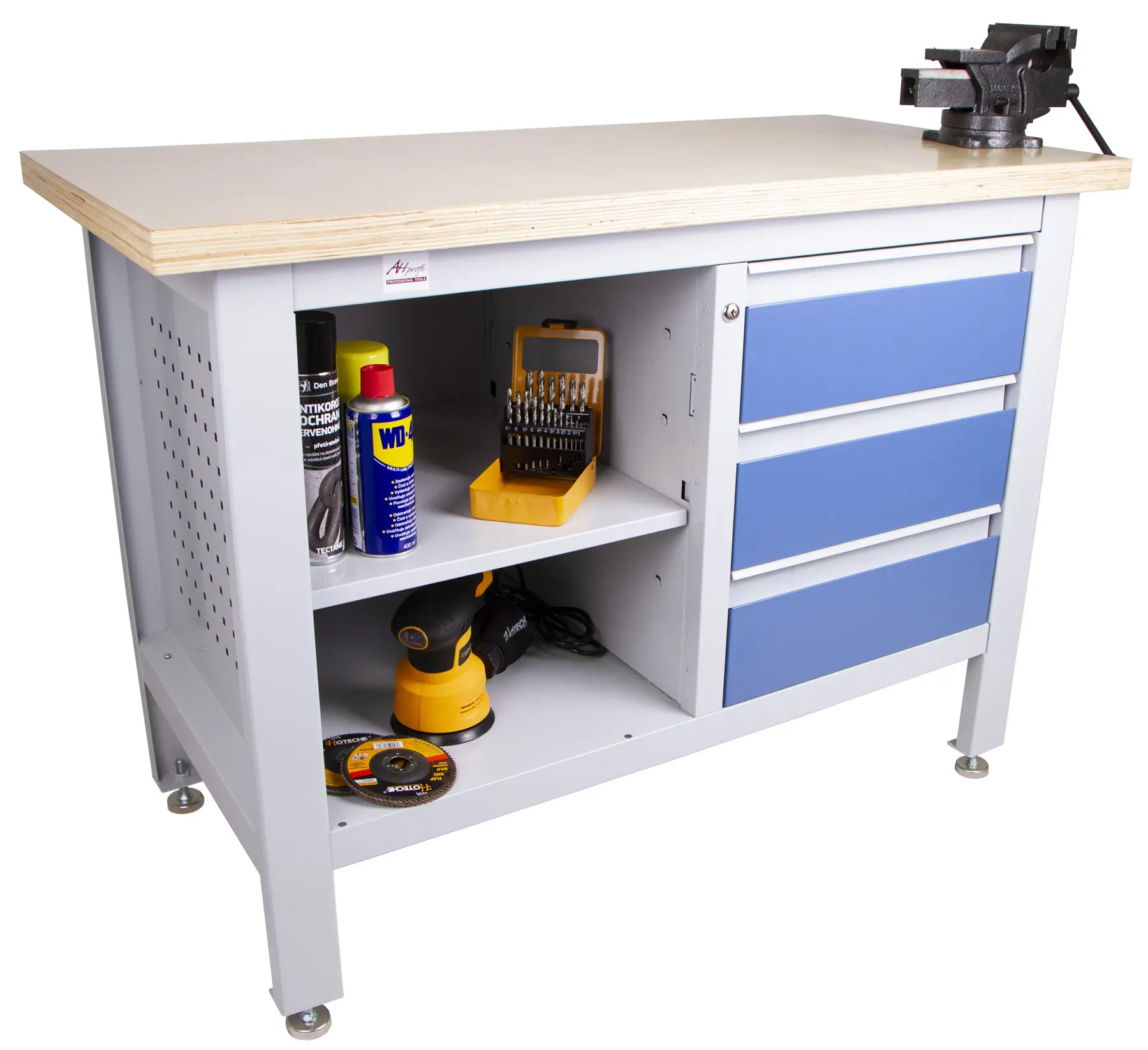 Profesionálny kovový pracovný stôl s tromi zásuvkami a policou, pracovnou doskou z masívneho drev...