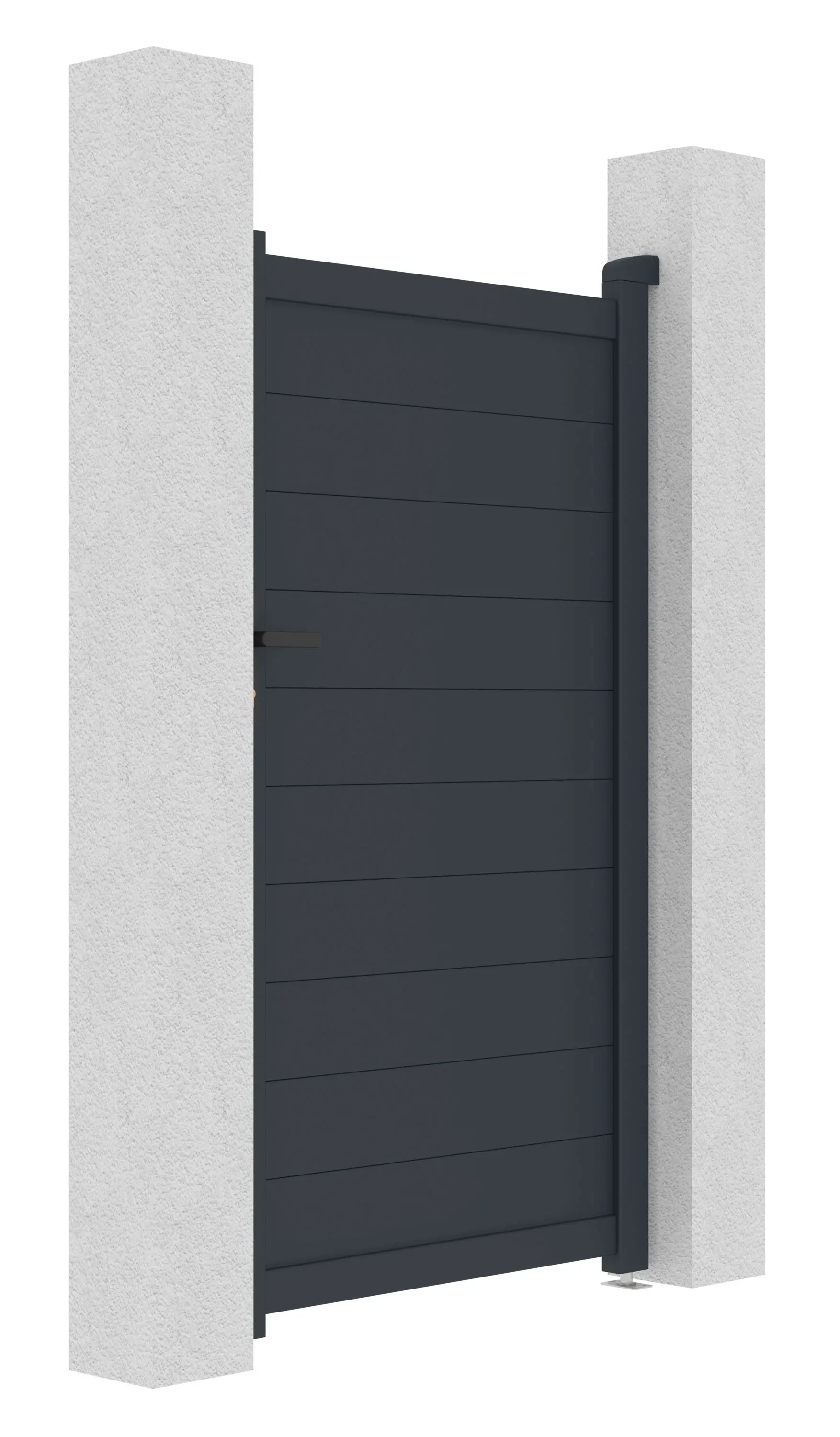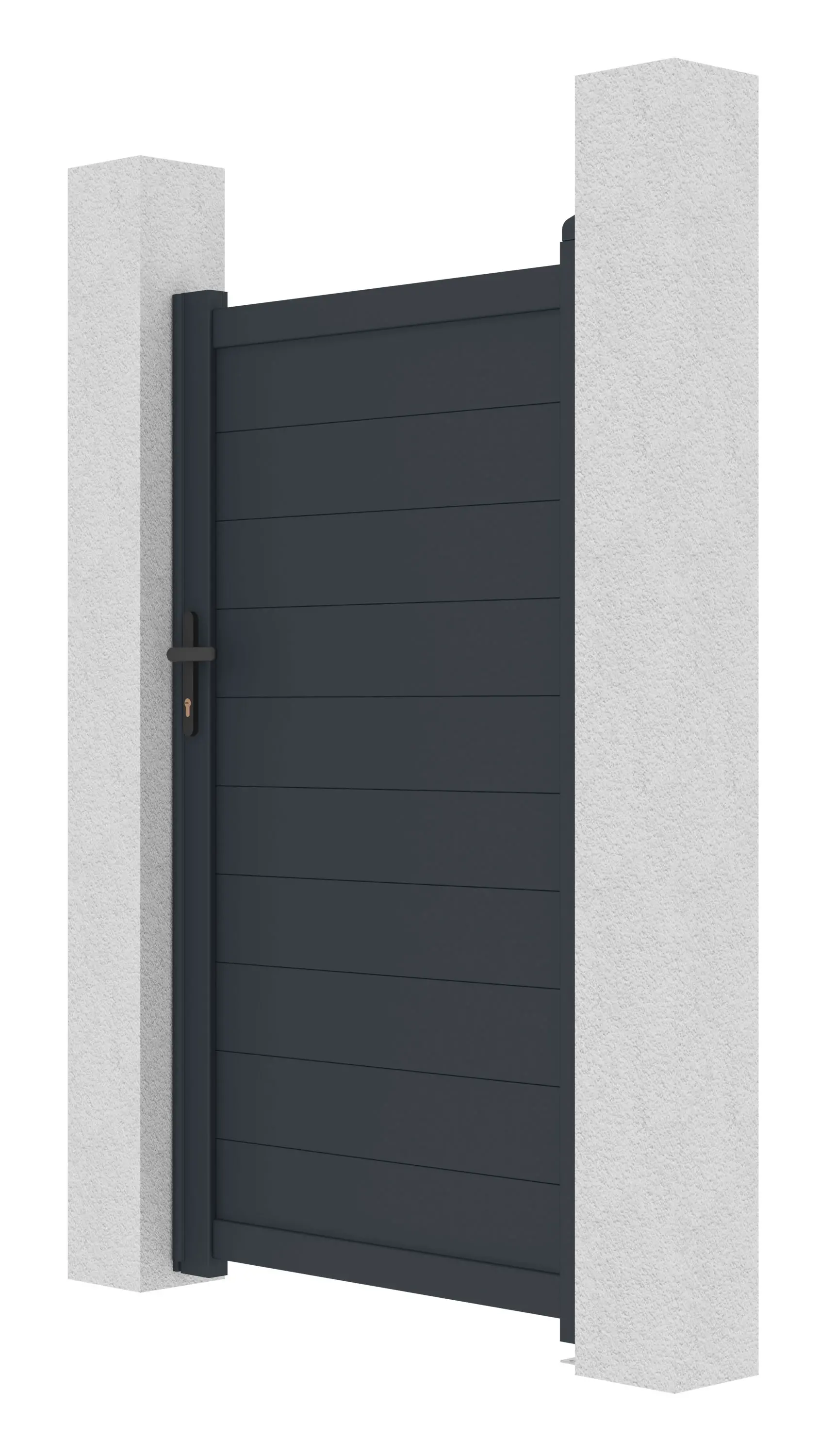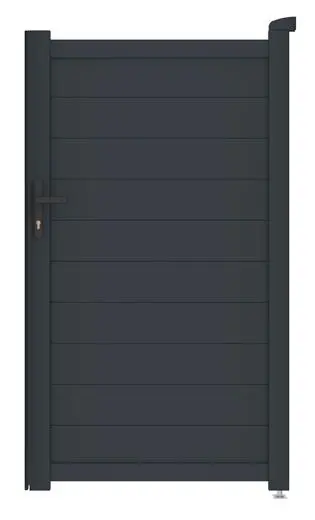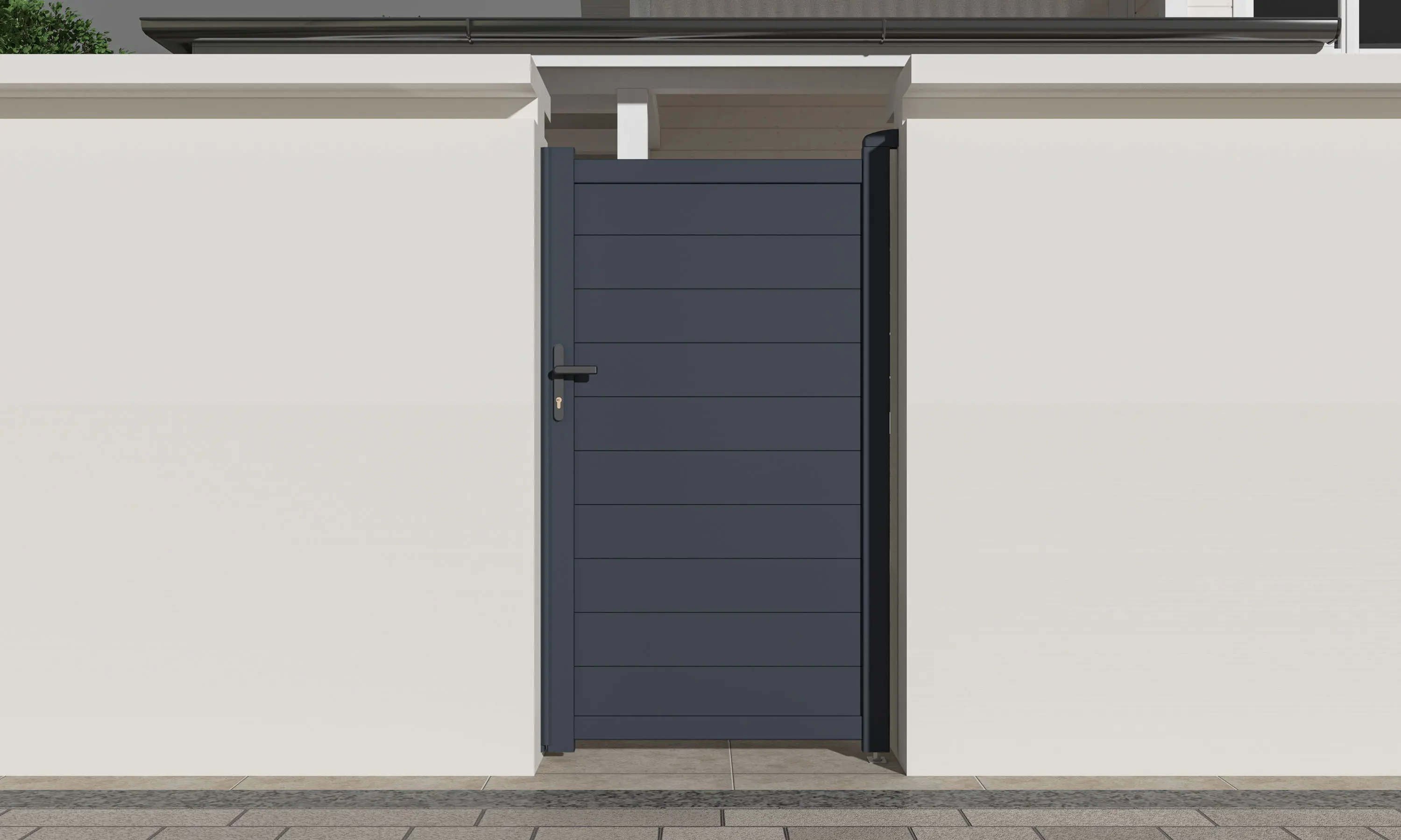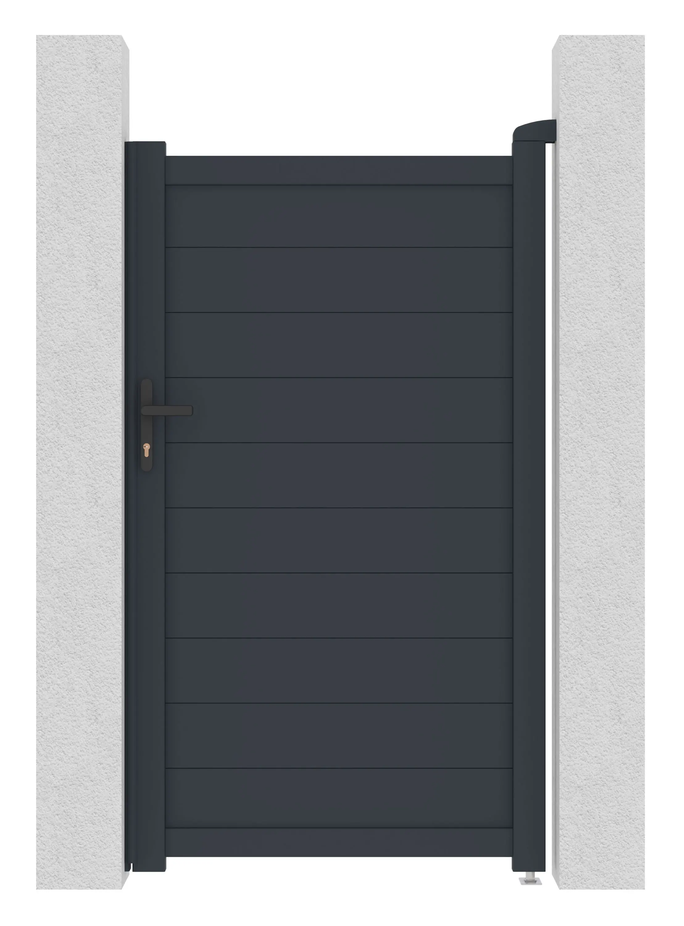 Výplň s horizontálne uloženými lamelami v atraktívnom grafitovom prevedení kombinuje dostatok súkromia s moderným dizajnom, takže bránka s otváraním dovnútra pristane každému typu oplotenej stavby.