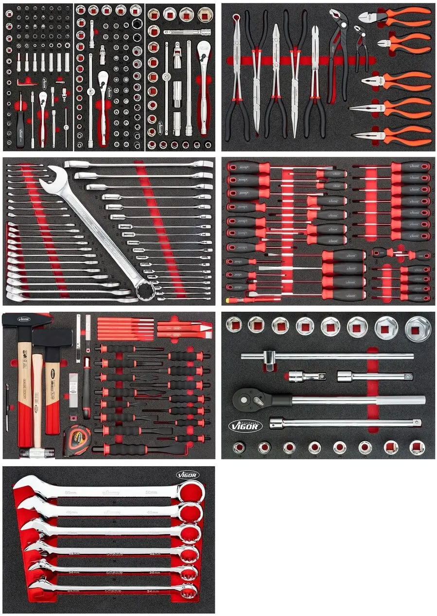 Vozík je vybavený 8 zásuvkami s 100 % výsuvom, vzájomným blokovaním a centrálnym zamykaním. Súčasťou je 298 ks profesionálneho náradia VIGOR, vhodného na údržbu a opravy nákladných automobilov.
