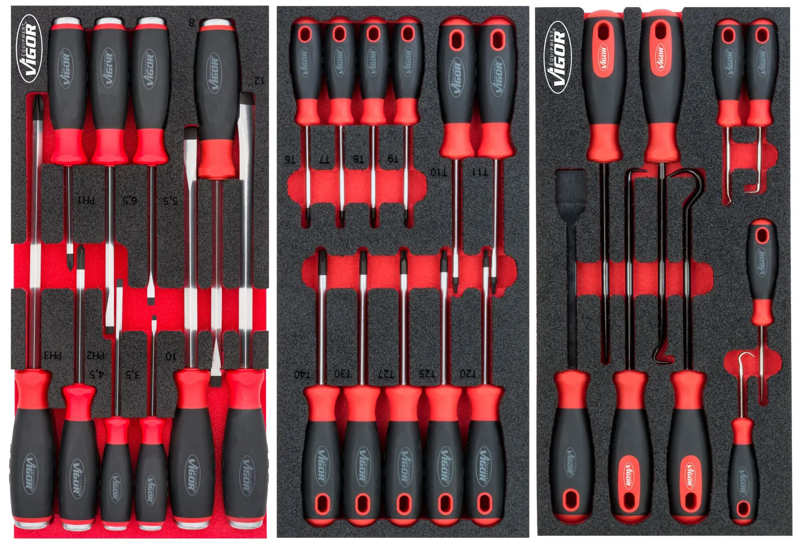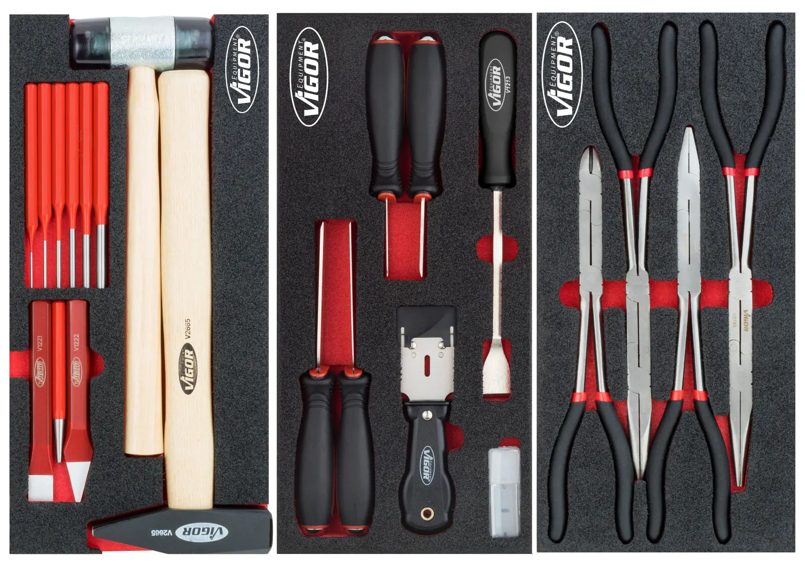 V zásuvkách sú penové výplne dielenských vozíkov s bežne používaným náradím v profesionálnej kvalite. V sadách náradia nájdete golu 1/4", 1/2", 3/8", nástrčné kľúče, sadu klieští, kladivo a paličku, veľkú sadu skrutkovačov (klasické, elektrikárske aj hodinárske), IMBUSY, veľkú sadu kľúčov a mnoho ďalšieho.