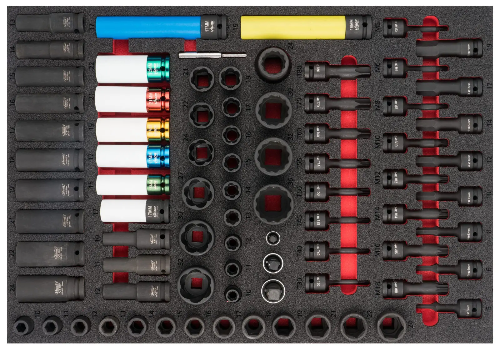 | 13 ks | Šesťhranné nástrčné kľúče (predĺžené): 10, 11, 12, 13, 14, 15, 16, 17, 18, 19, 21, 22, 24 mm |