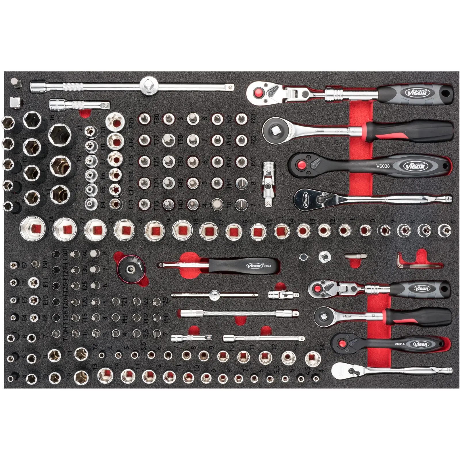 Penová vložka o rozmeroch (š x h x v) 563 x 393 x 35 mm obsahuje celkom 165 ks profesionálnych nástrčných kľúčov a gola sady 1/4" a 3/8".