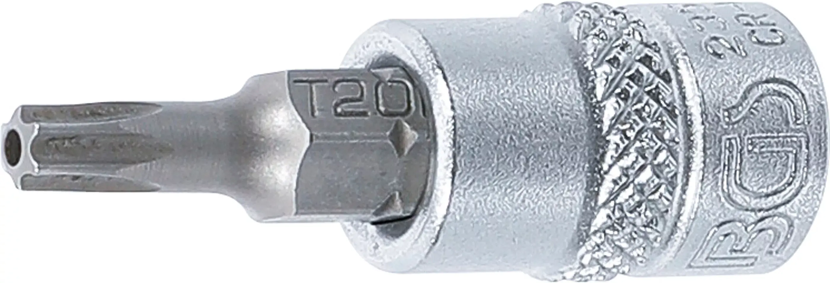 Nástrčná hlavica s bitom Torx T20 a 1/4" vnútorným štvorhranom na prácu so skrutkami s otvorom Torx.