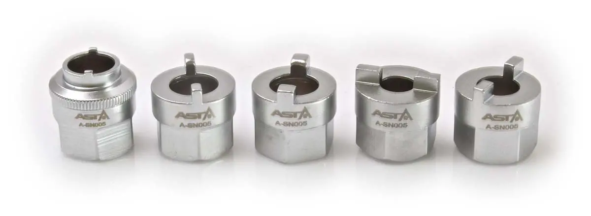 Sada špeciálnych nástrčných hlavíc na horné matice tlmičov, určená na prácu na podvozkoch vozidiel rôznych značiek.