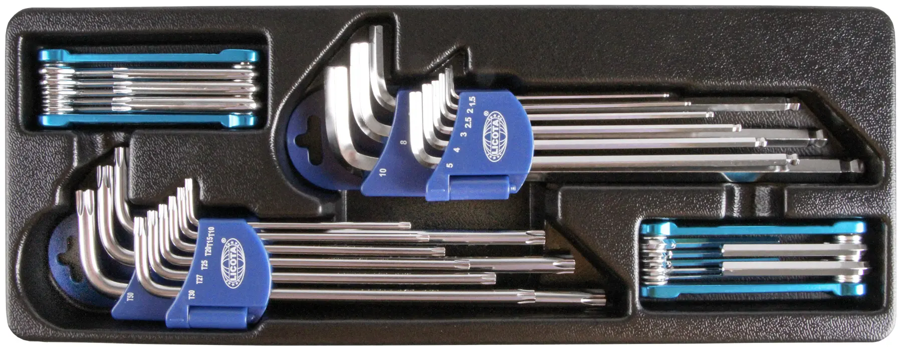 Sada imbusových a TORX kľúčov v plastovej výplni pojazdného vozíka, značka LICOTA, celkom 33 kuso...