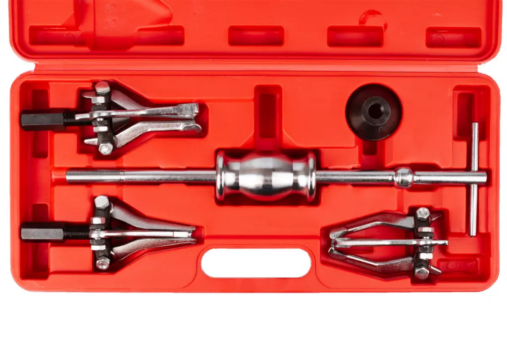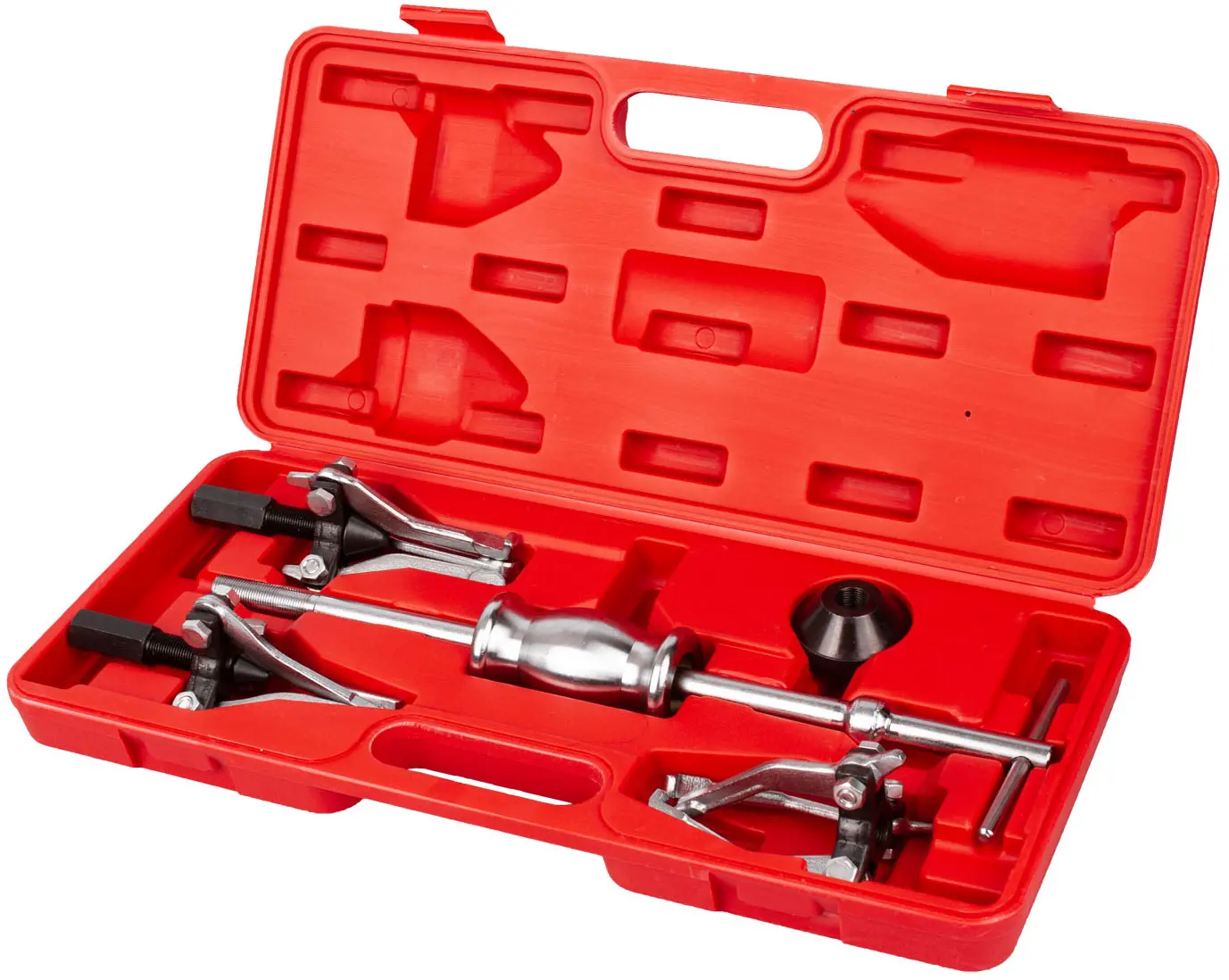 sada obsahuje: 1 vodiacu tyč s rukoväťou, 1 kladivo, 1 ks 3-čeľusťového vnútorného sťahováku 15 - 30 mm, 1 ks 3-čeľusťového sťahováku 30 - 80 mm, 1 ks 3-čeľusťového sťahováku 15 - 80 mm