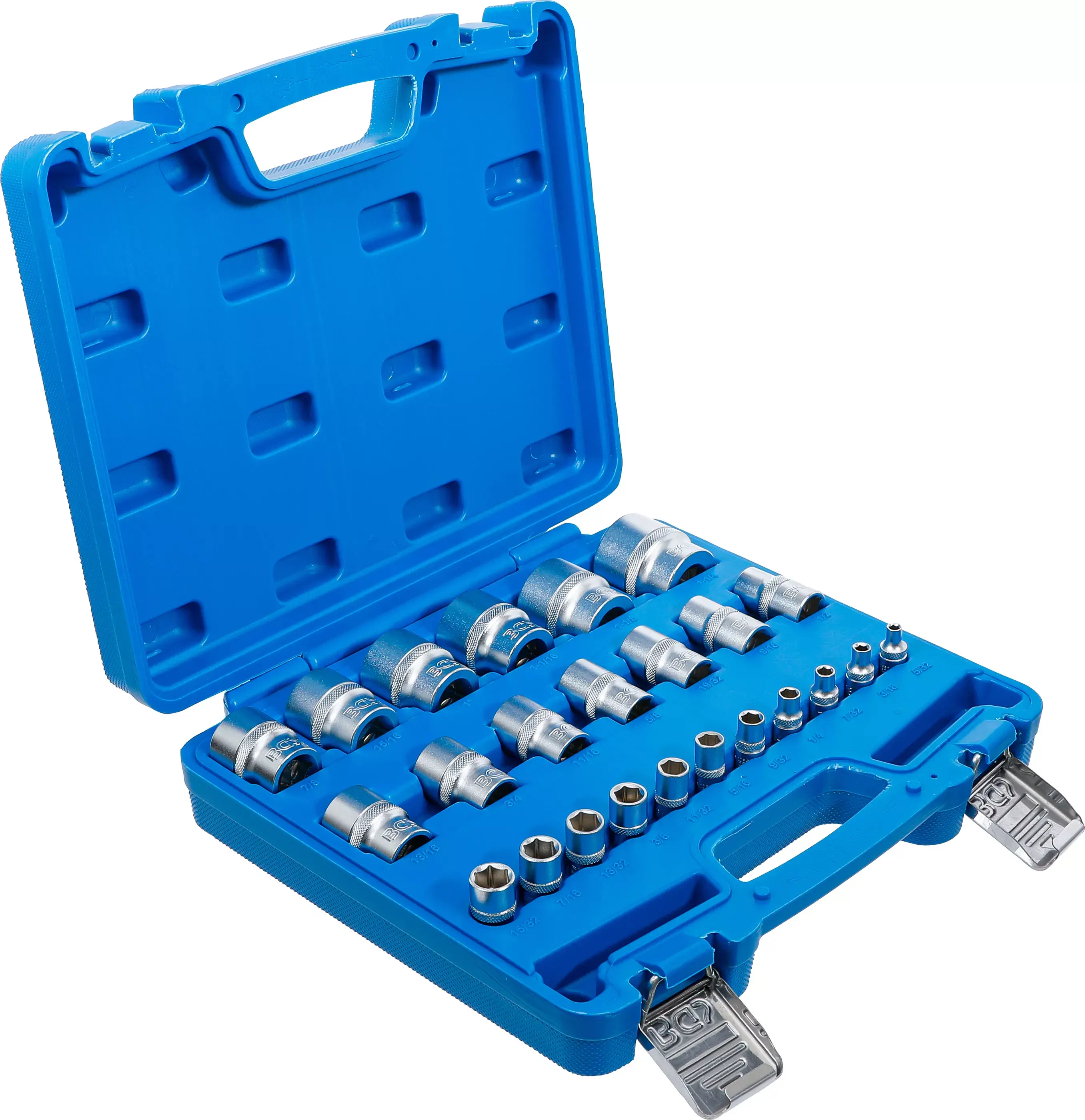 24-dielna sada nástrčných hlavíc so šesťhranným profilom v palcových rozmeroch je určená na prácu s imperiálnymi skrutkami a maticami.