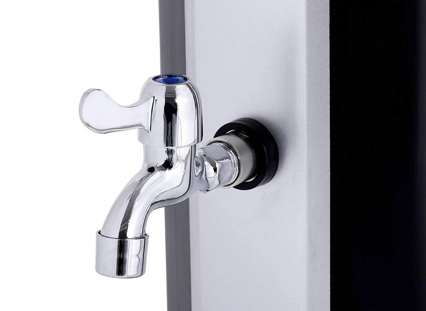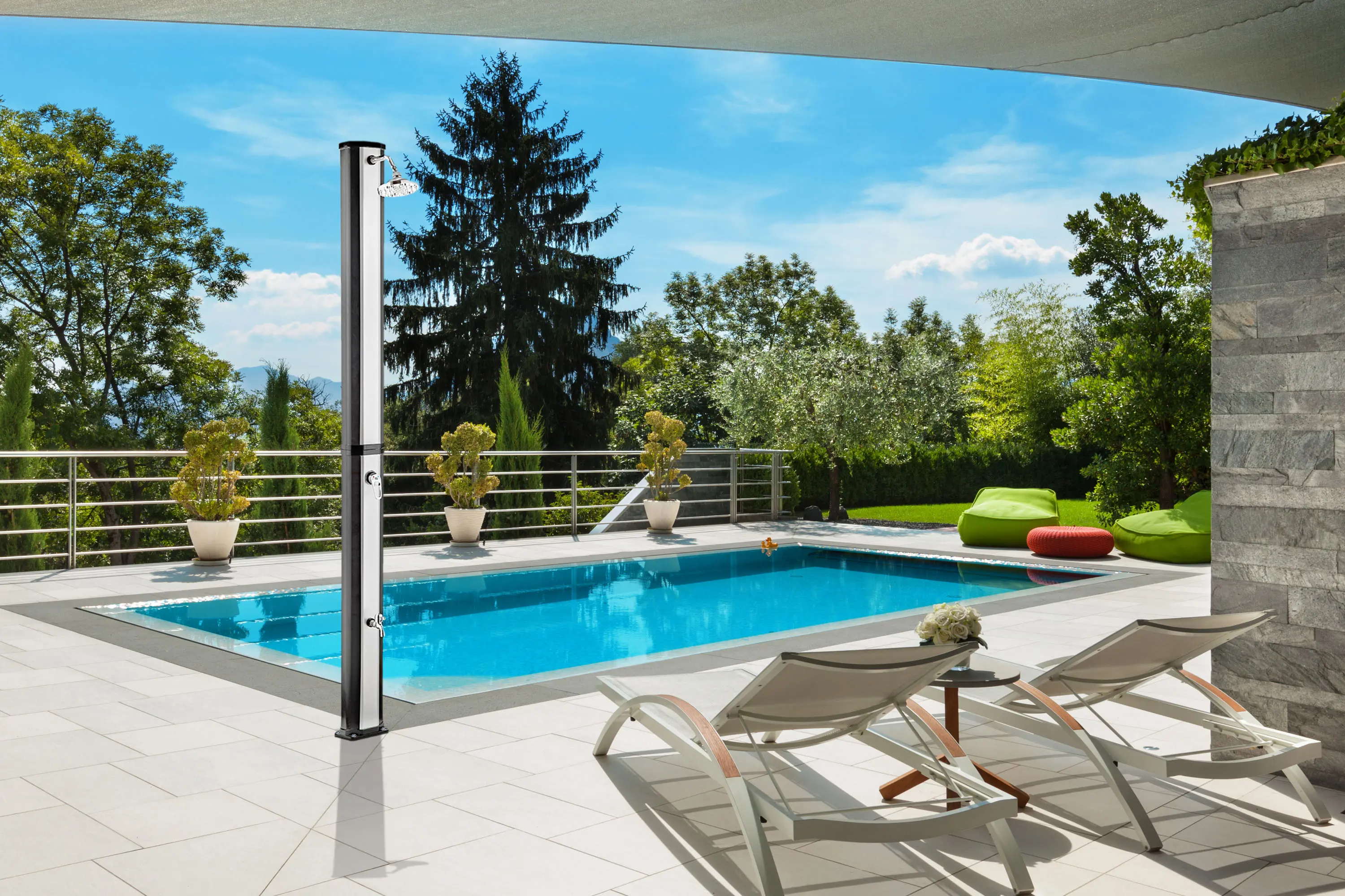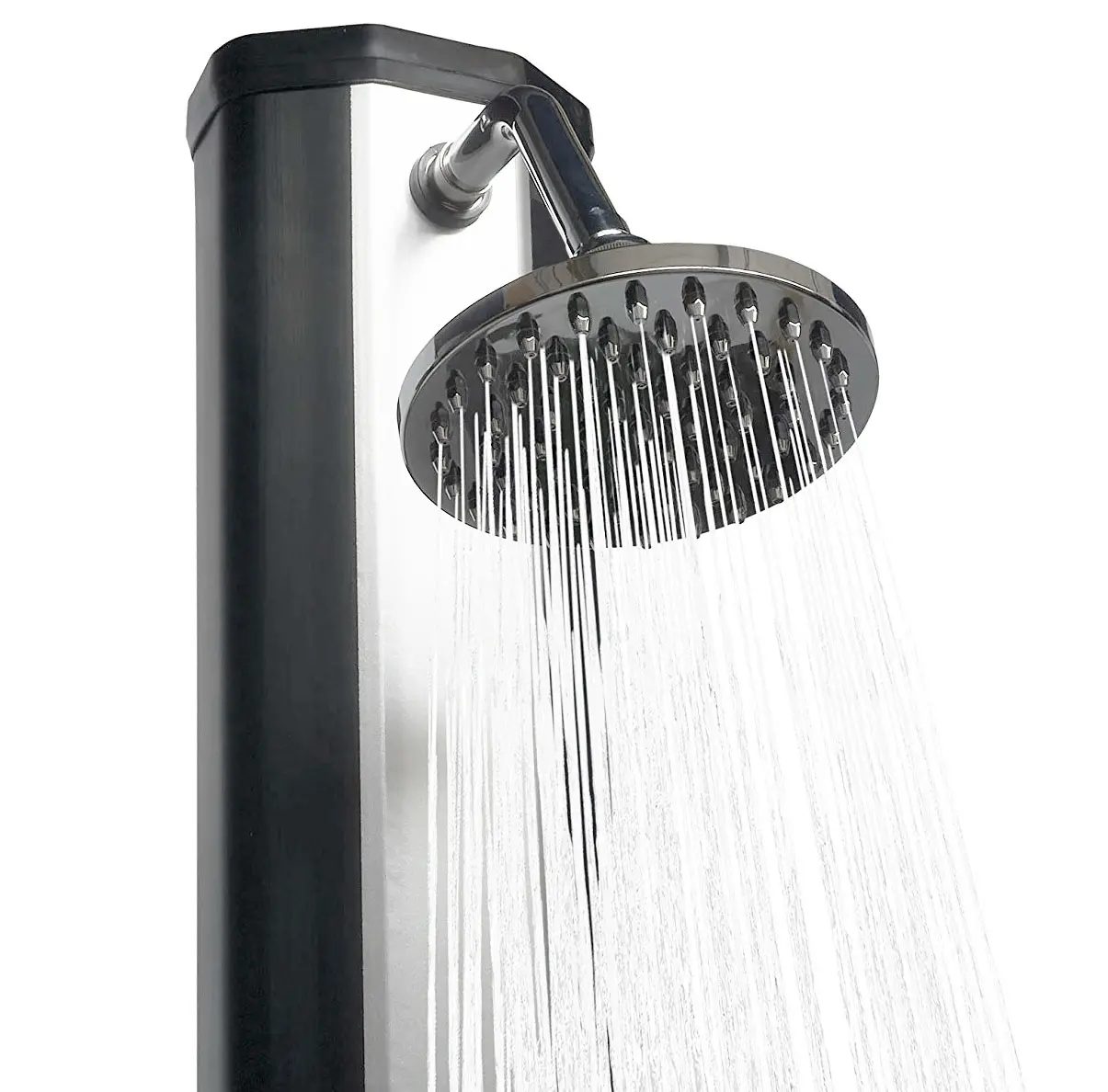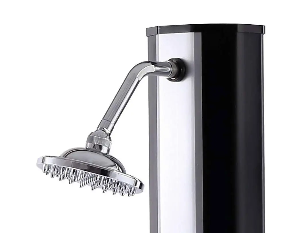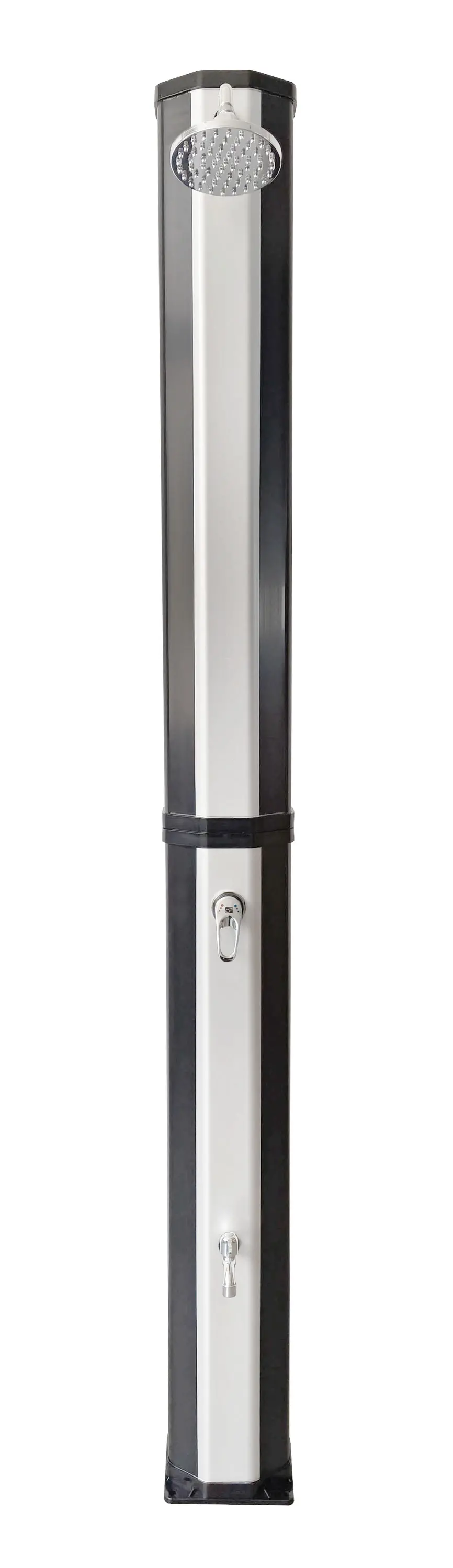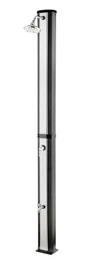 Telo sprchy v elegantnej čierno striebornej farbe slúži zároveň ako solárny kolektor. Absorbuje slnečné lúče a ohrieva vodu bez potreby elektriny alebo plynu. Sprcha pred kúpaním navyše pomáha udržať vodu v bazéne čistejšiu a znižuje množstvo nečistôt, ktoré by sa inak dostali do bazéna.