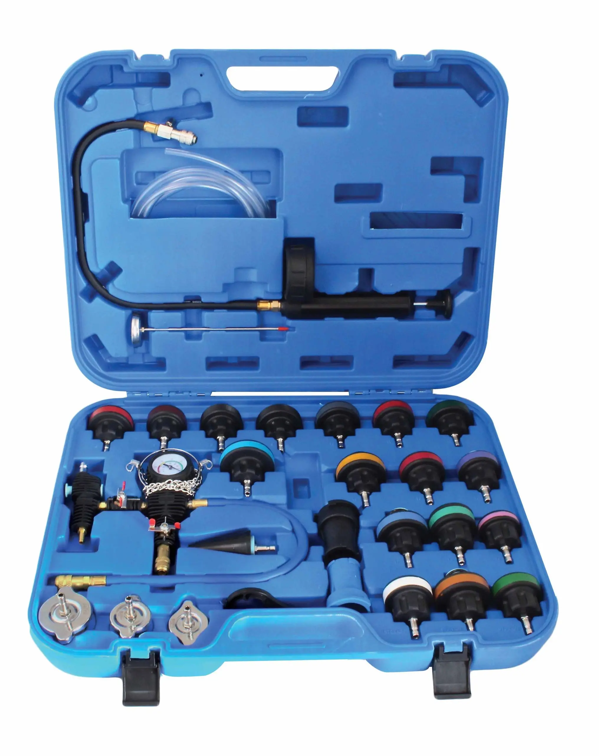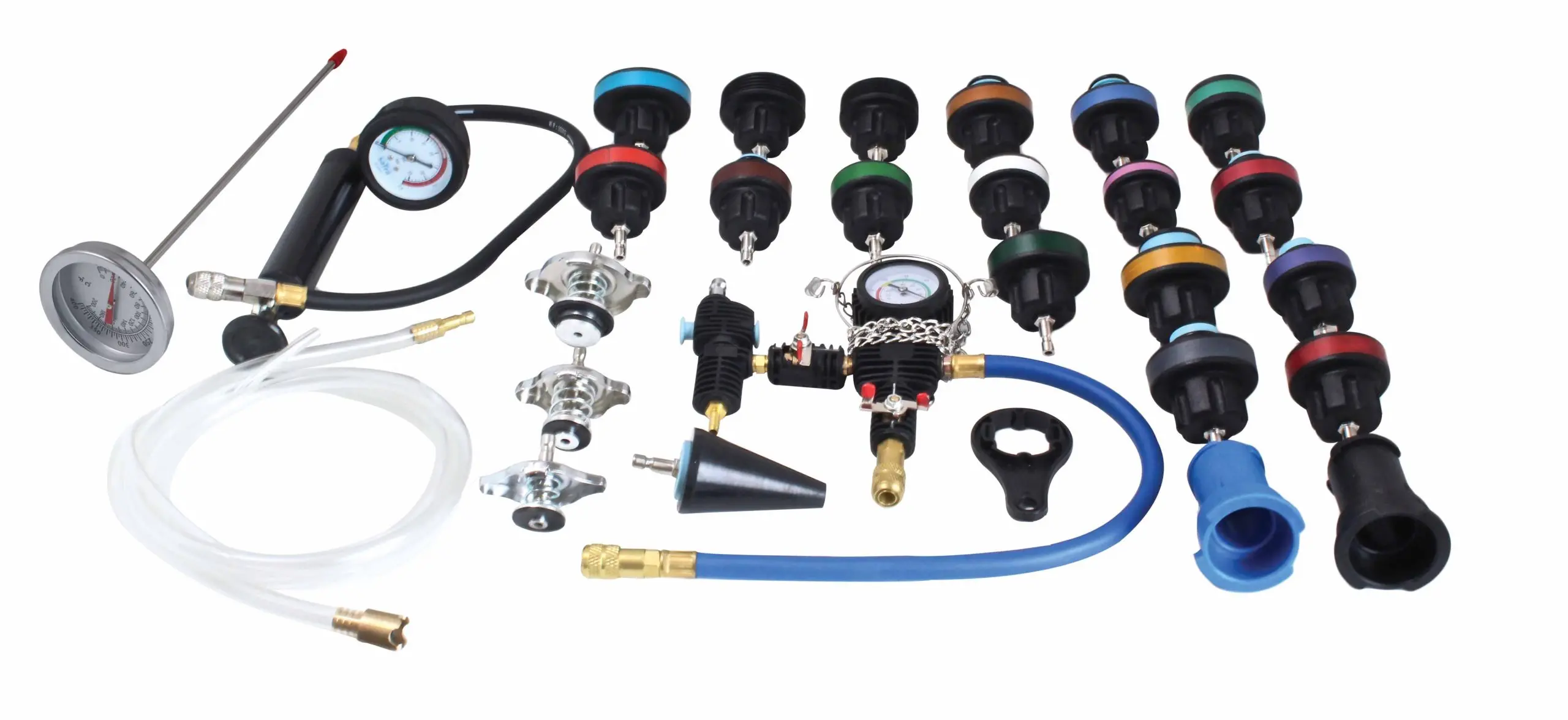 Profesionálna sada na testovanie tesnosti chladiacej sústavy a rýchlu výmenu chladiacej kvapaliny u väčšiny bežných aj zahraničných vozidiel.