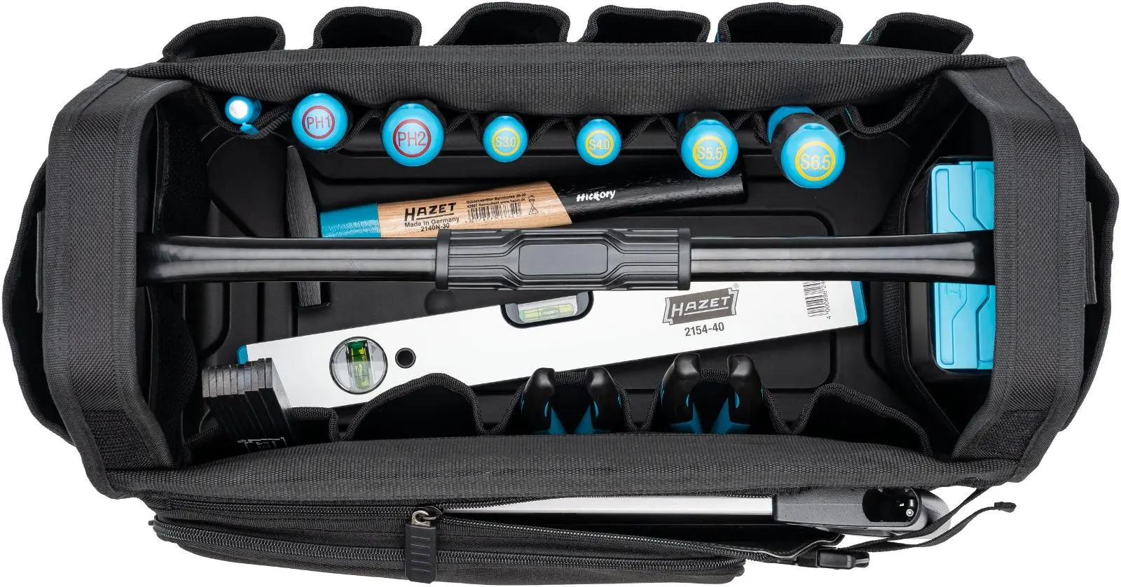 Vybavenie: 6 skrutkovačov (PH1–PH2, 0,5×3–1,2×6,5), skúšačka fáz, zámočnícke kladivo, skladací meter 200 cm, vodováha 40 cm, silové kliešte 180 mm, kombinované kliešte 160 mm, píla na kov 390 mm, 59-dielna sada nástrčných kľúčov (PH, PZ, T10–T40, ploché, šesťhranné, Torx, Tamper Resistant Torx, bity 25–89 mm)