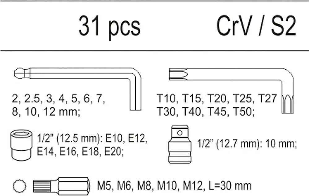 Sada 31 kusov kľúčov Imbus, Torx a Spline bitov z CrV ocele. Sada je prehľadne srovnána vo vložke do zásuvky z PVC.