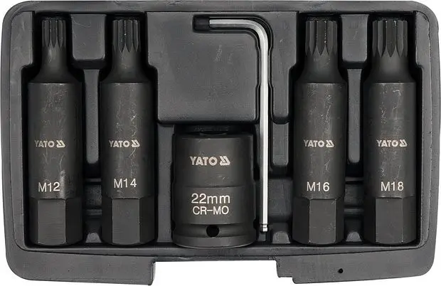 Sada bitov XZN M12, M14, M16, M18 dĺžka 107mm. Bity sú ukončené šesťhranom 22mm a aplikujú sa cez adaptér 22mm s vnútorným štvorhranom 3/4 ". Sú vyrobené z vysoko kvalitnej chróm-molybdénovej zliatiny ocele.