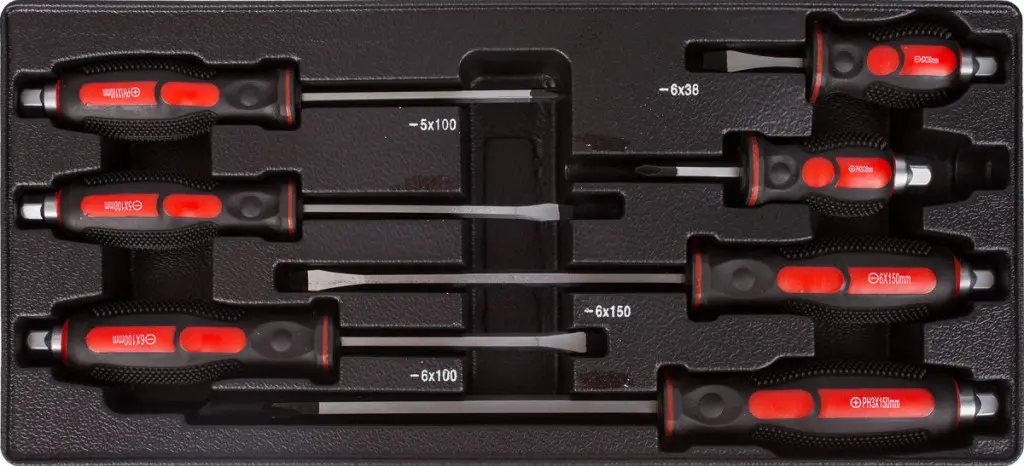 Súprava 7 ks skrutkovačov. Ploché: 6x38mm, 5x100mm, 6x100mm, 6x150mm; Krížové: PH2x38mm, PH1x100m...