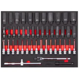 Rázové hlavice a sada nástrčných kľúčov v penovej výplni. Sada 45 ks. 25 kovaných hlavíc 8 - 32 m...