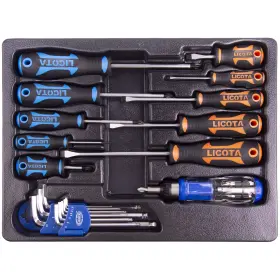 Sada imbusových kľúčov a skrutkovačov v plastovej výplni pojazdného vozíka, obsahuje HEX kľúče 1,...