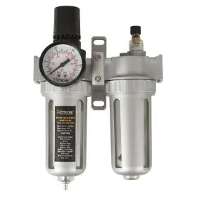 Regulátor tlaku vzduchu 1/4" s odlučovačom vody a primazávaním pre pneumatické náradie.