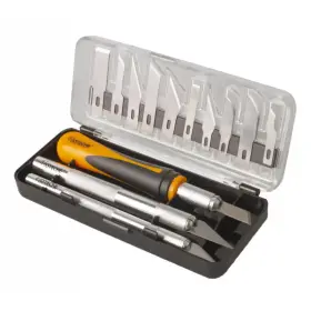 Sada 3 ks skalpelov s 13mi vymeniteľnými nástavcami v plastovom puzdre.