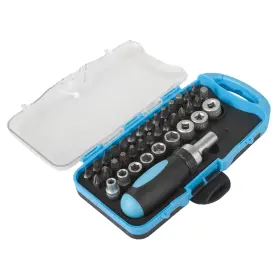 Sada 38 ks bitov a nástrčných kľúčov s račňovým skrutkovačom v plastovom boxe.