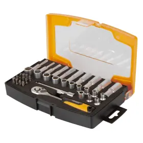 Sada bitov s mini račňou, predlžovacím nástavcom a nástrčnými kľúčmi. Plastový box. 28 ks.