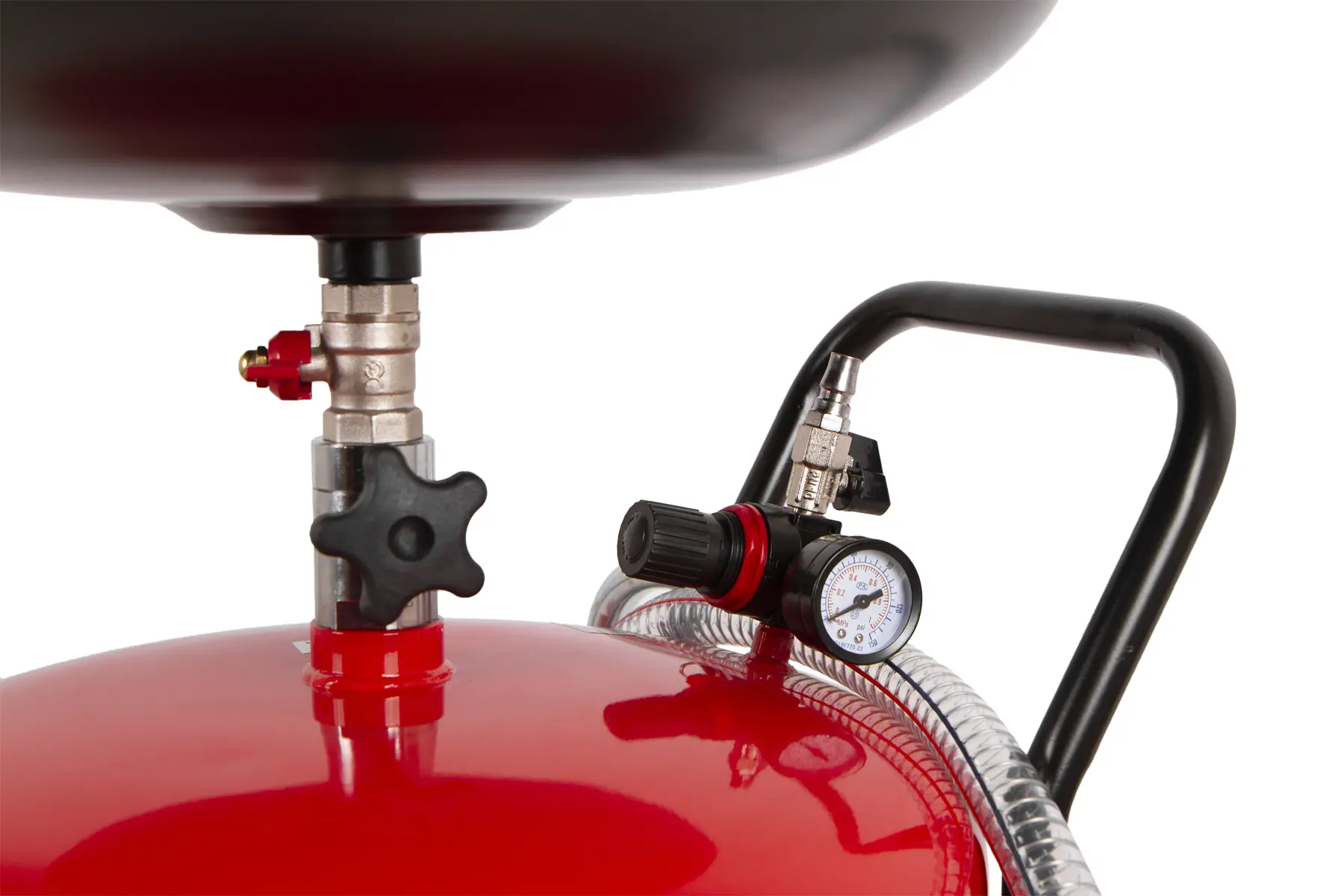 Po naplnení zásobníka sa nahromadený olej vypúšťa pripojením stlačeného vzduchu (0,8 bar), olej vyteká integrovanou hadicou s kovovou koncovkou.