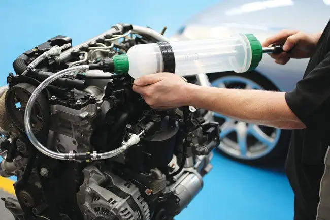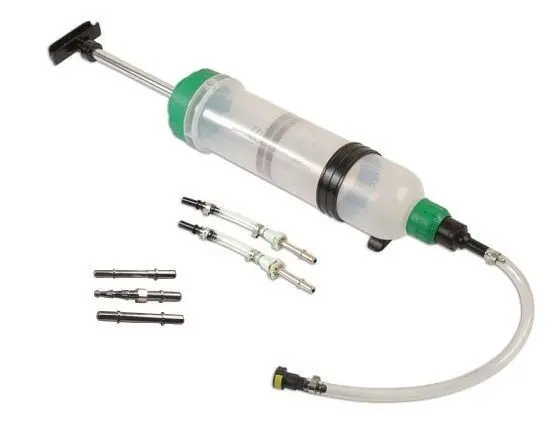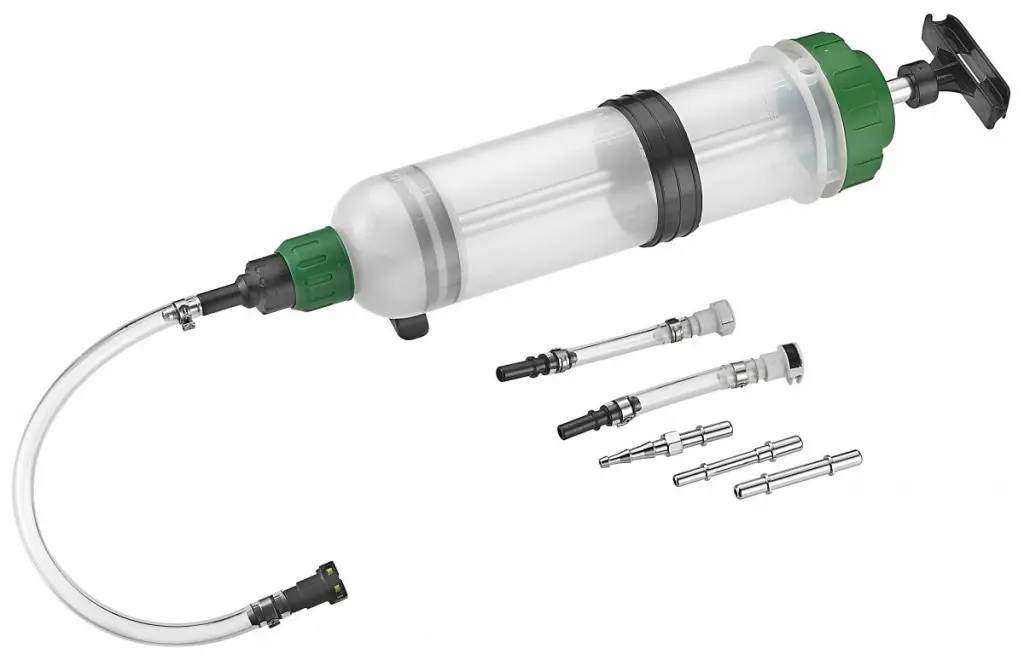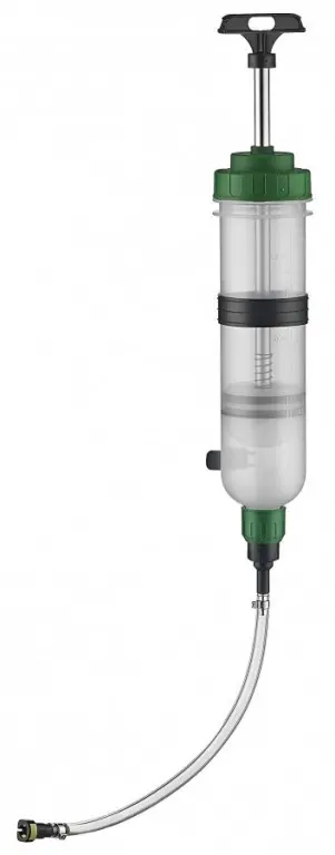 Ručná plnička a odsávačka nafty a benzínu typu injekčná striekačka s obsahom zásobníka 1,5 l.