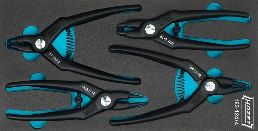 Sada kvalitných klieští pre poistné krúžky HAZET, 4 kusy v penovej vložke, obsahuje kliešte pre v...