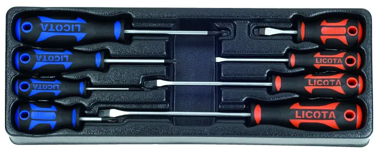 Plastová výplň pojazdných vozíkov a skriniek so sadou 8 skrutkovačov, značka LICOTA, obsahuje 4 p...