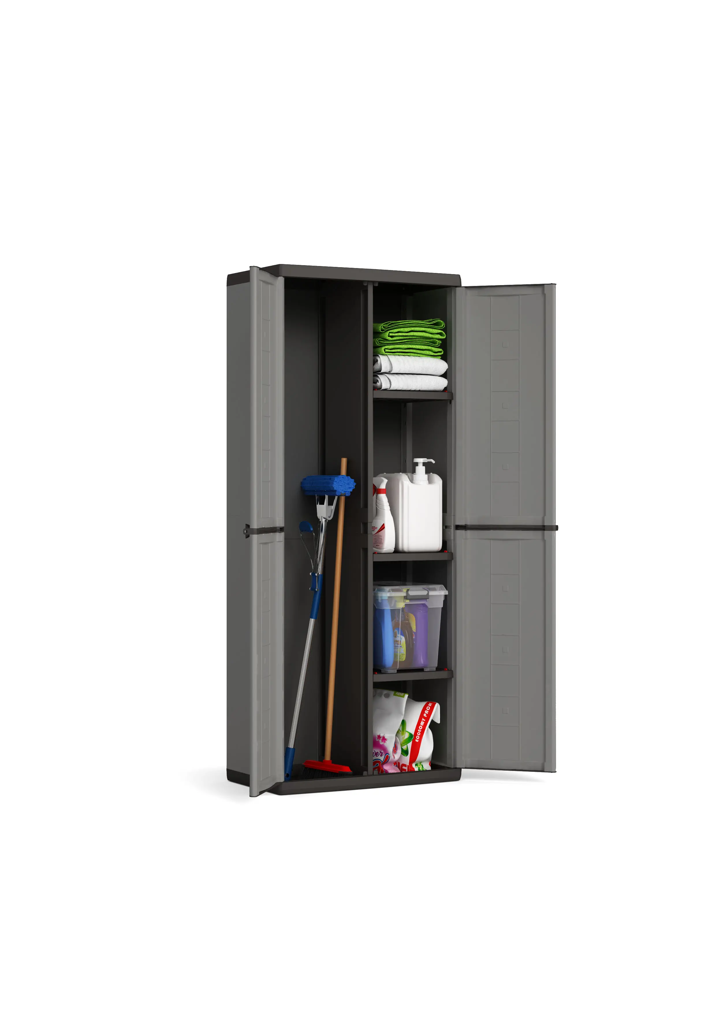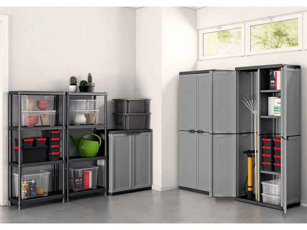 Skriňa Keter Jolly Utility prináša premyslenú kombináciu klasického policového systému a otvoreného priestoru pre väčšie náradie alebo napríklad metlu. Vďaka nízkej hmotnosti 9,57 kg ju ľahko premiestnite, pričom zostáva stabilná a pevná. Výškovo nastaviteľné police umožňujú prispôsobiť vnútorné usporiadanie presne podľa potrieb. Uzamykací systém zvyšuje bezpečnosť uložených vecí, a tak skriňa skvele poslúži nielen v domácnosti, ale aj na chate či v technickom zázemí.