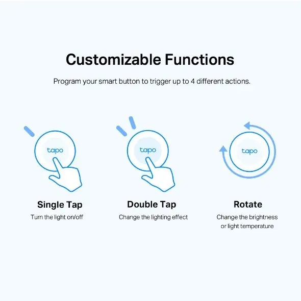 Chytré bezdrátové tlačítko TP-Link Tapo S200B ocení každý, komu nevyhovuje ovládání smart osvětlení, elektroniky a jiných zařízení Tapo pomocí hlasu nebo aplikace. Jediným klepnutím zhasnete nebo vypnete zařízení, dvojitým klepnutím změníte efekt osvětlení a rotací si přizpůsobíte jas a teplotu světla.