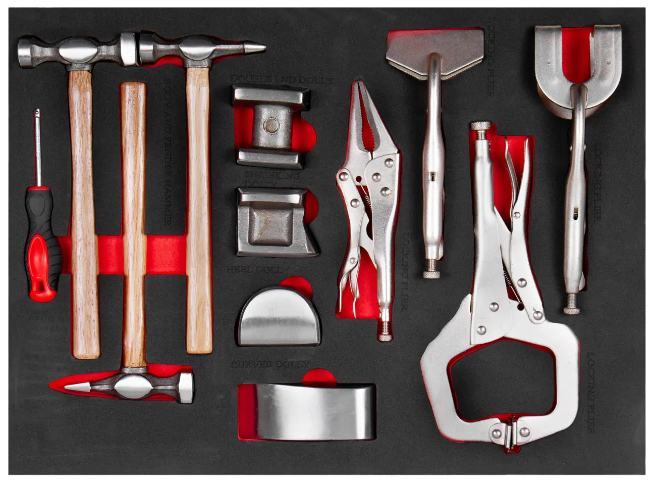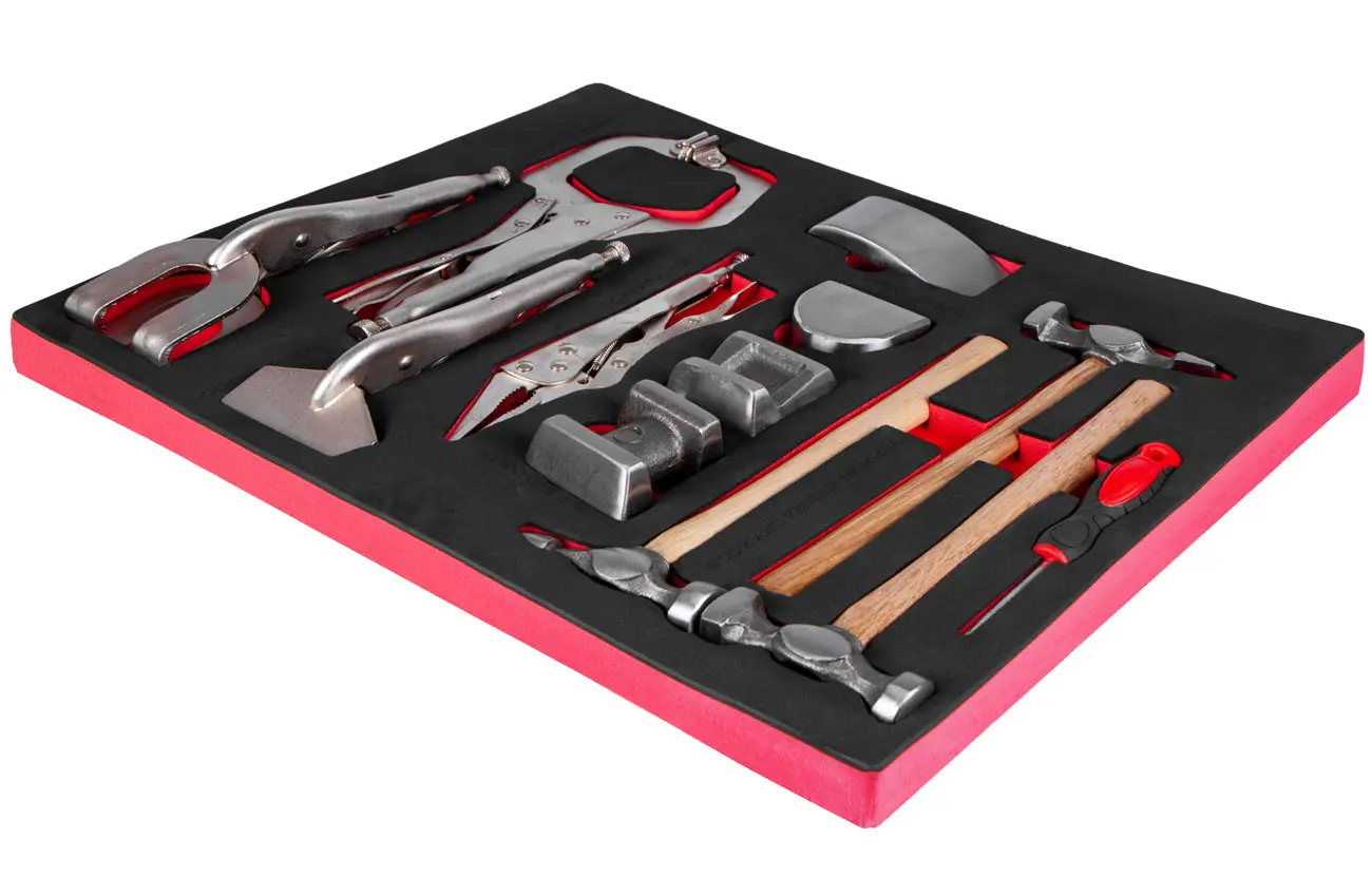 Sada klempiarskych kladív, babiek a zvierok, vhodná na opravy karosérií a klempiarske práce, uložená v prehľadnej penovej výplni.