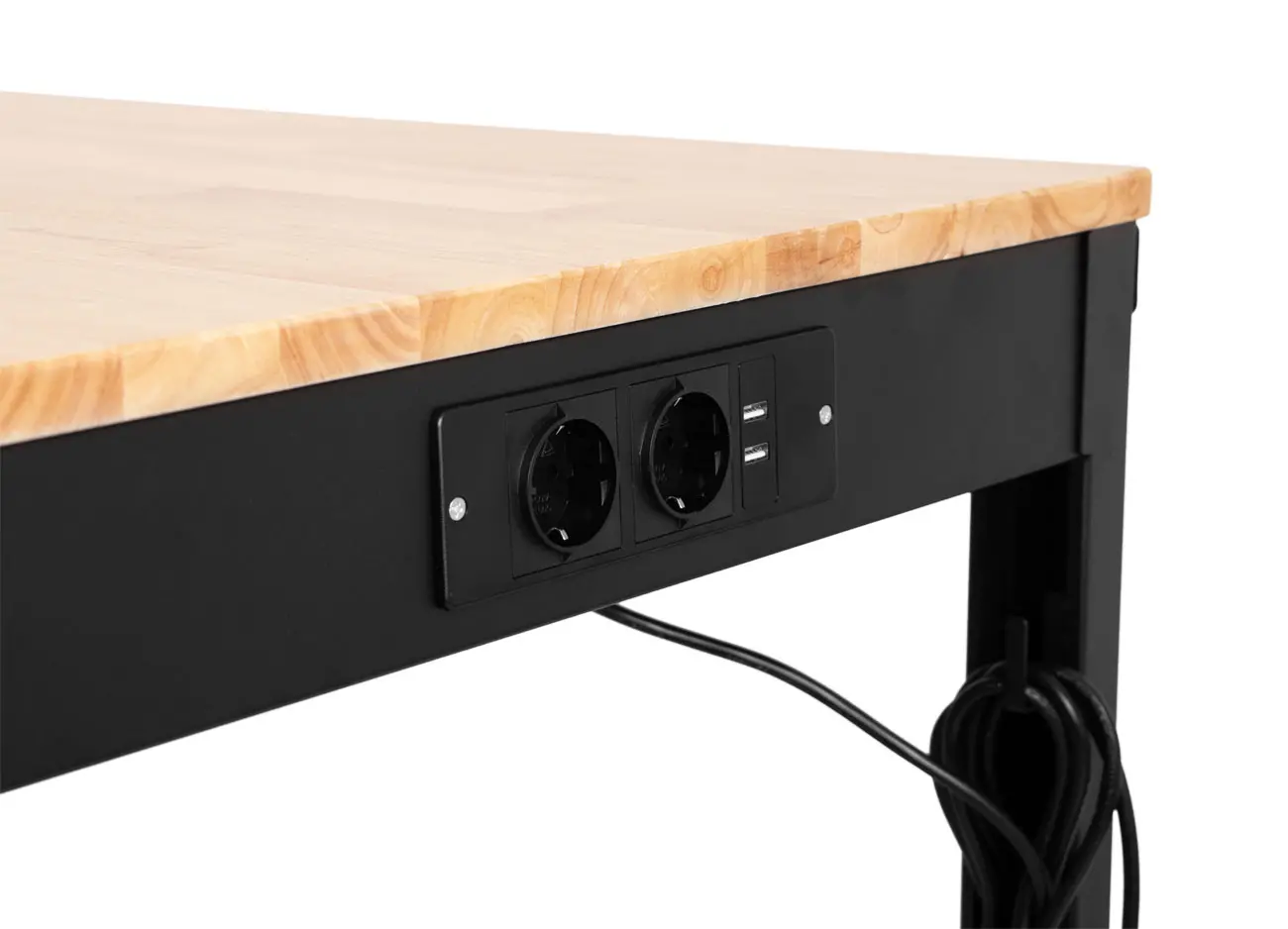 Stôl má oceľovú konštrukciu s práškovou povrchovou úpravou a pracovnú dosku z kaučukového dreva s hrúbkou 20 mm.