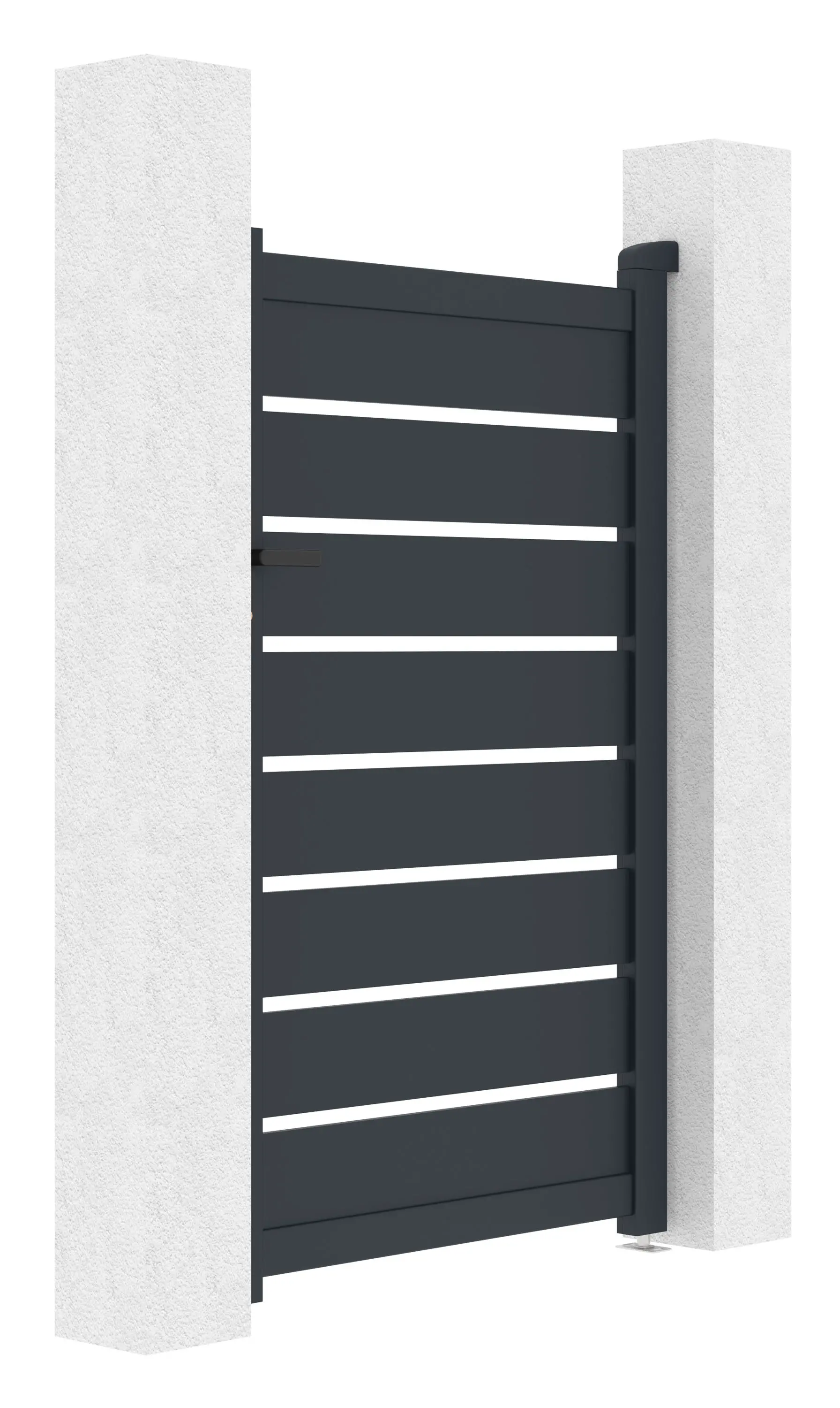 Výplň s horizontálne uloženými lamelami v atraktívnom grafitovom prevedení kombinuje dostatok súkromia s moderným dizajnom, takže bránka s otváraním dovnútra pristane každému typu oplotenej stavby.