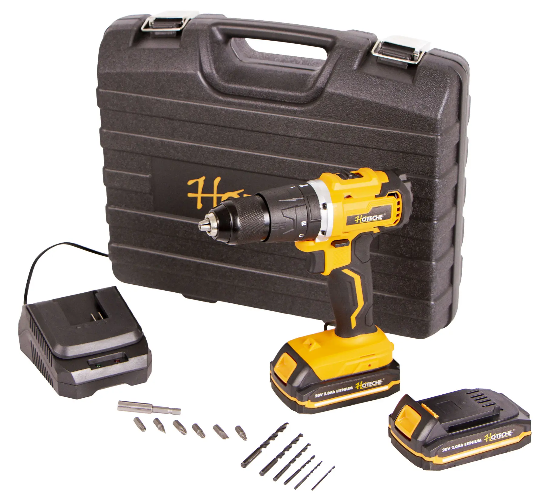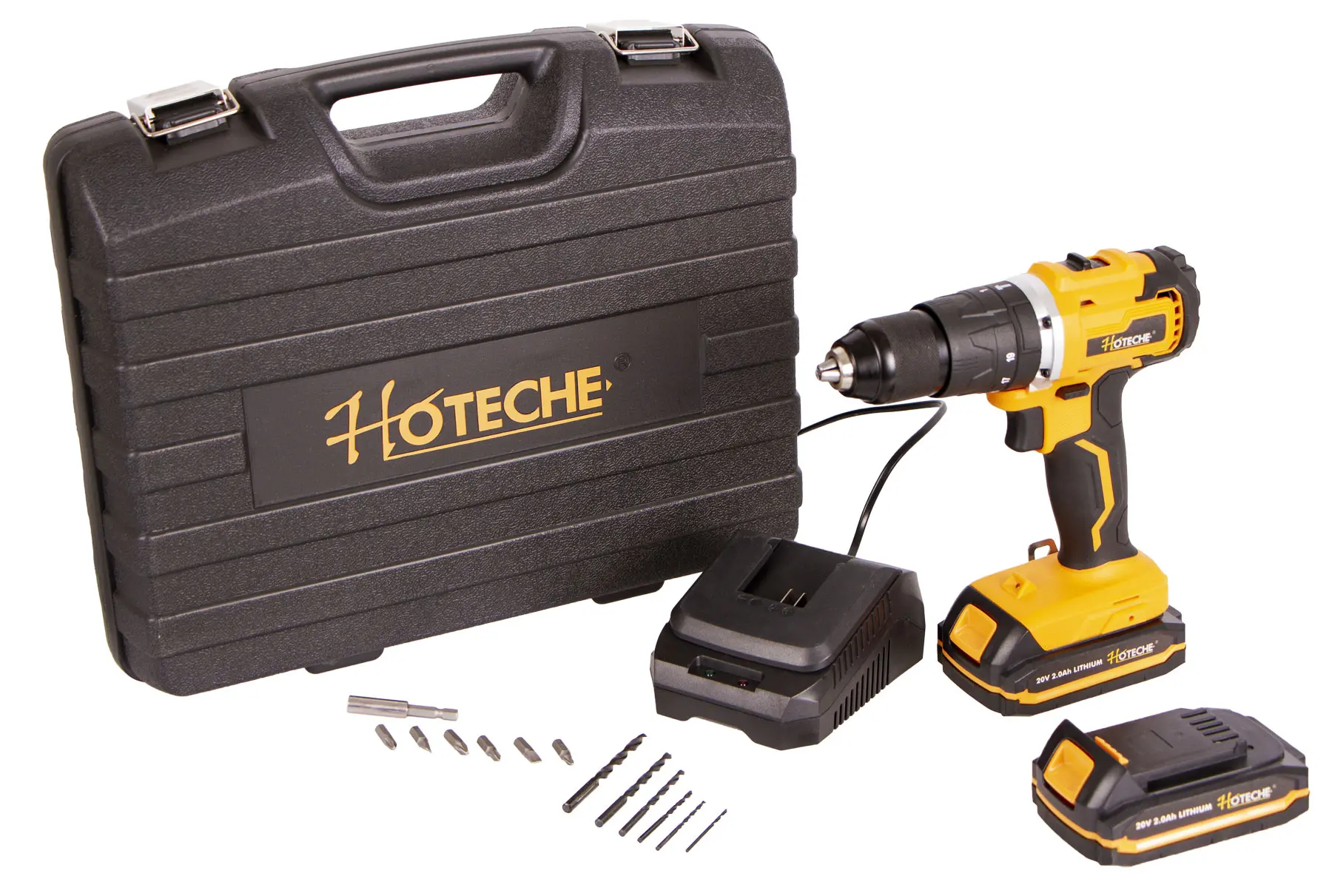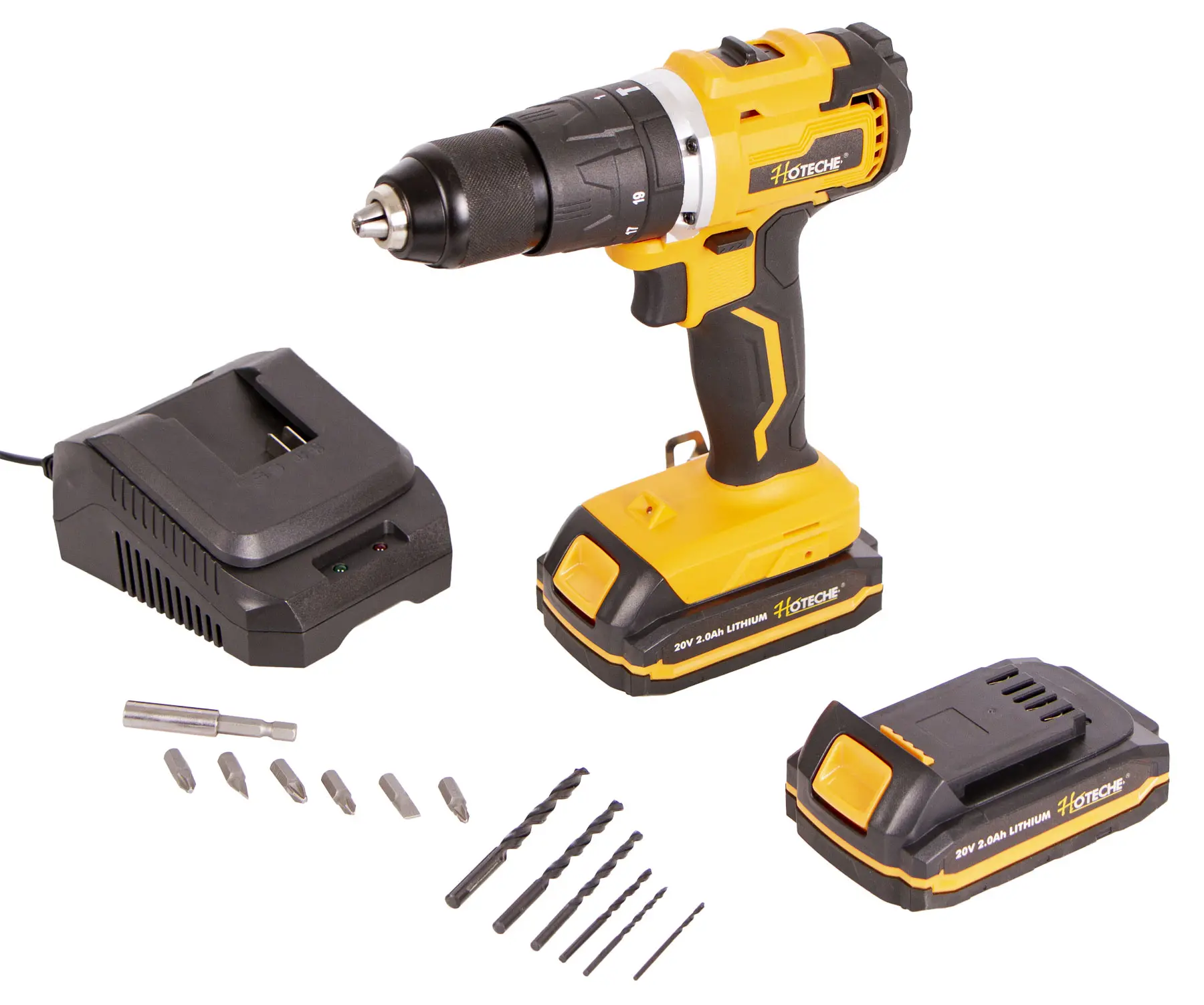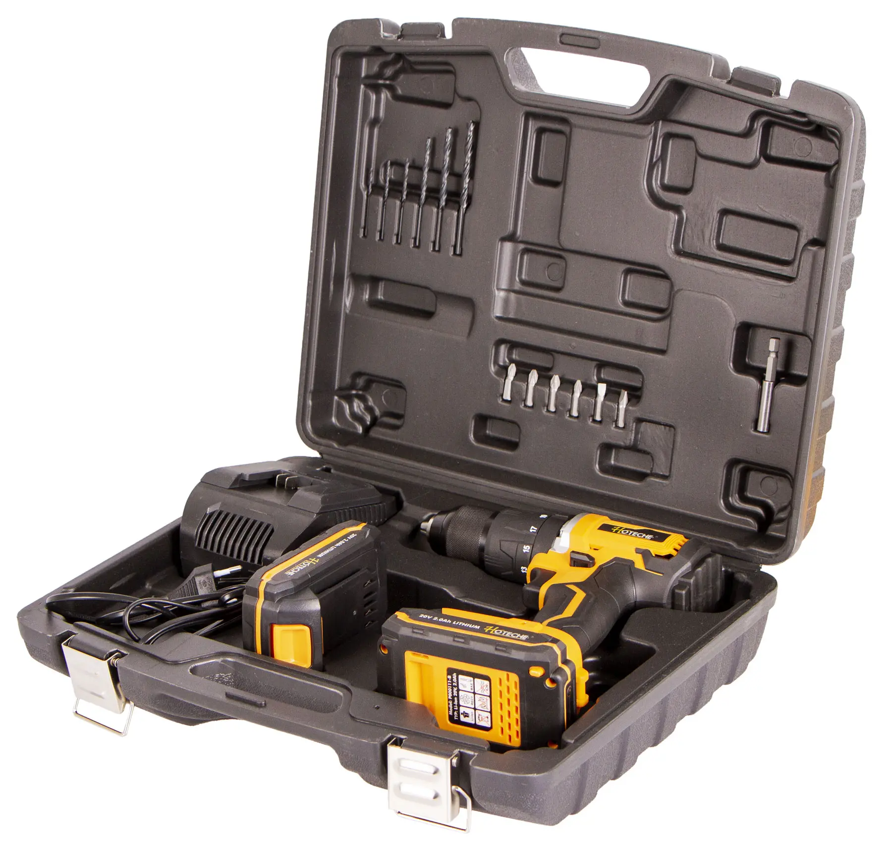 Súčasťou balenia sú 2 Li-ion akumulátory 20 V / 2 Ah s indikátorom nabitia, nabíjačka a sada vrtákov a bitov v praktickom kufríku.