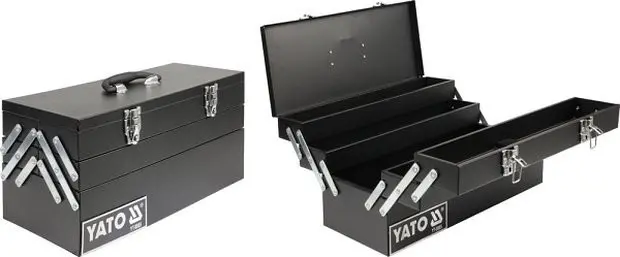 Kovový box na uloženie náradia vyrobený z oceľového plechu.