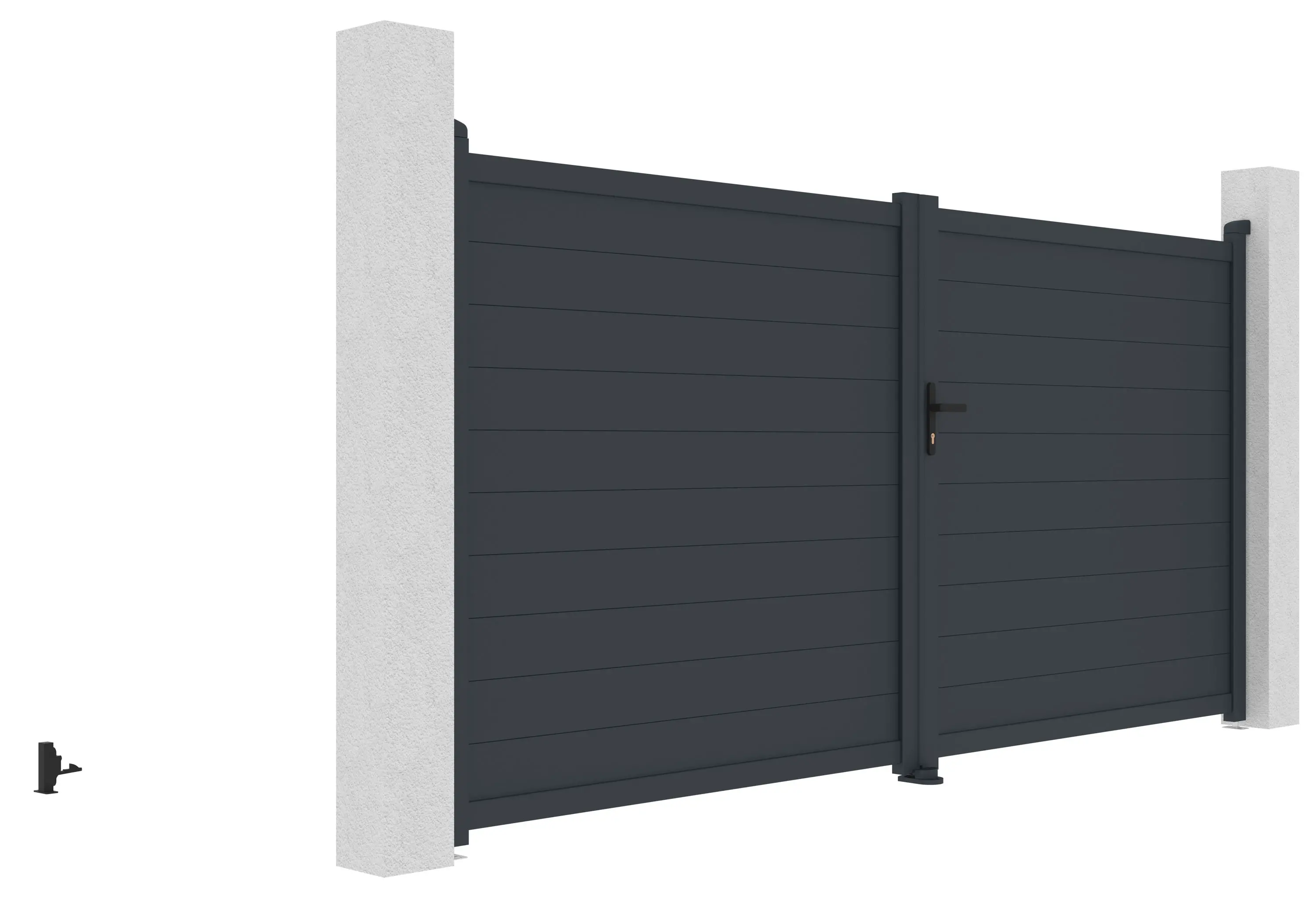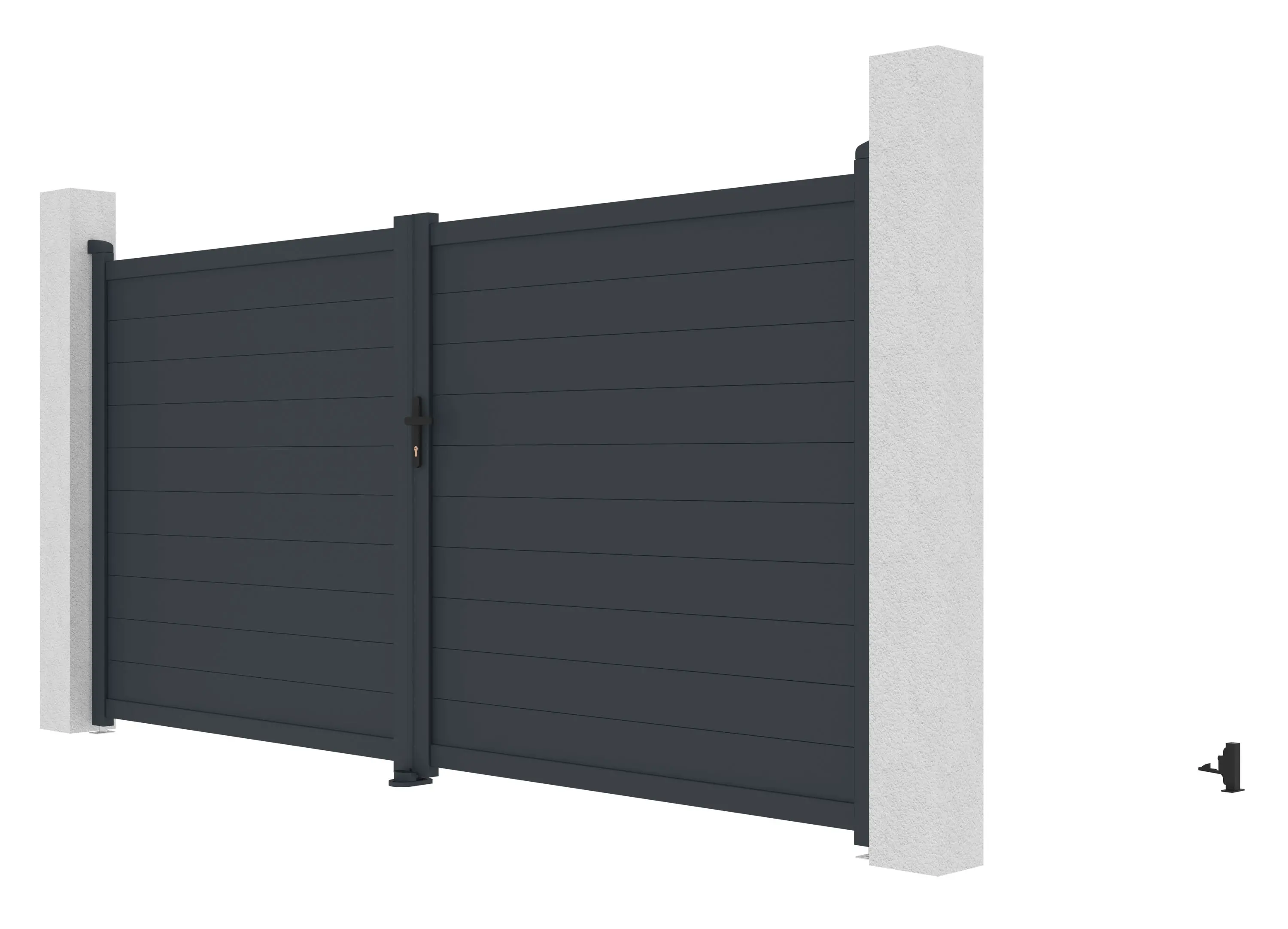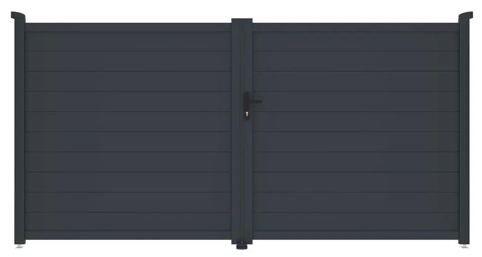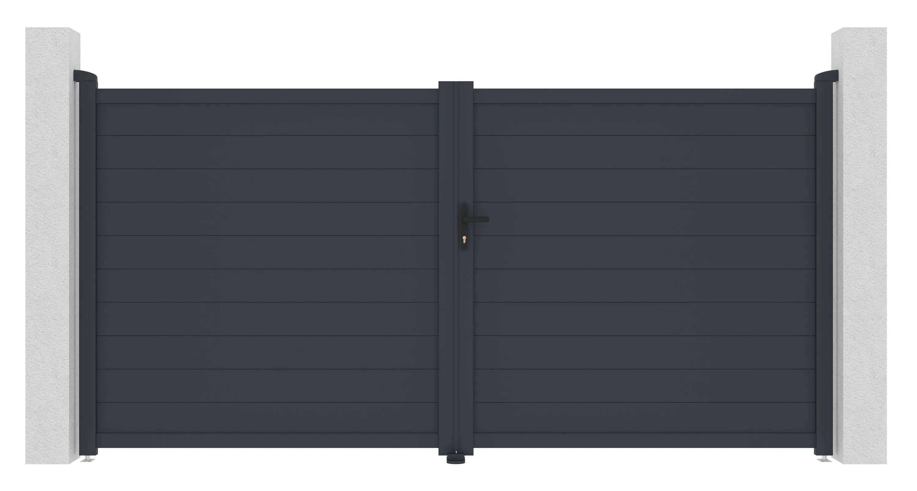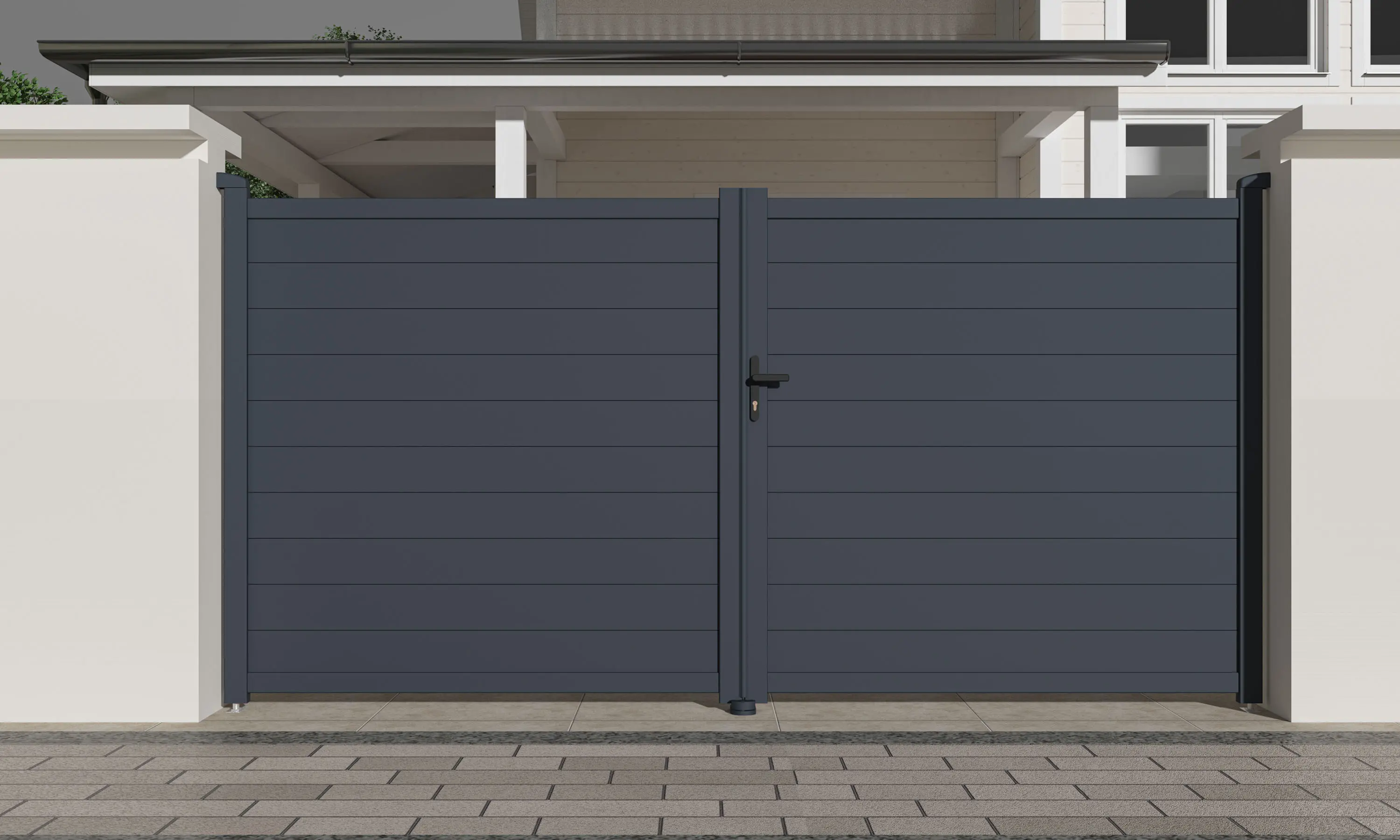 Výplň s horizontálne uloženými lamelami v atraktívnom grafitovom prevedení kombinuje dostatok súkromia s moderným dizajnom, takže brána s otváraním dovnútra pristane každému typu oplotenej stavby.