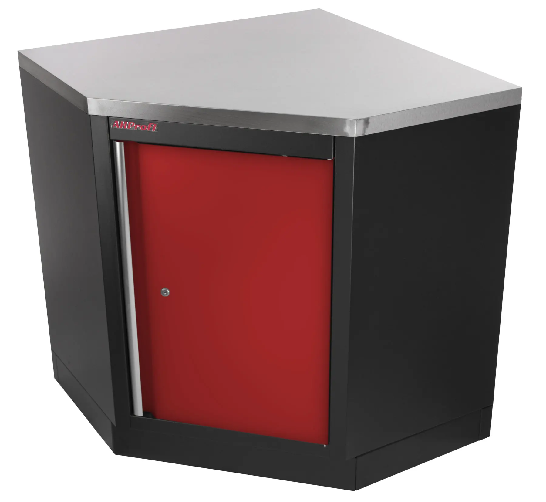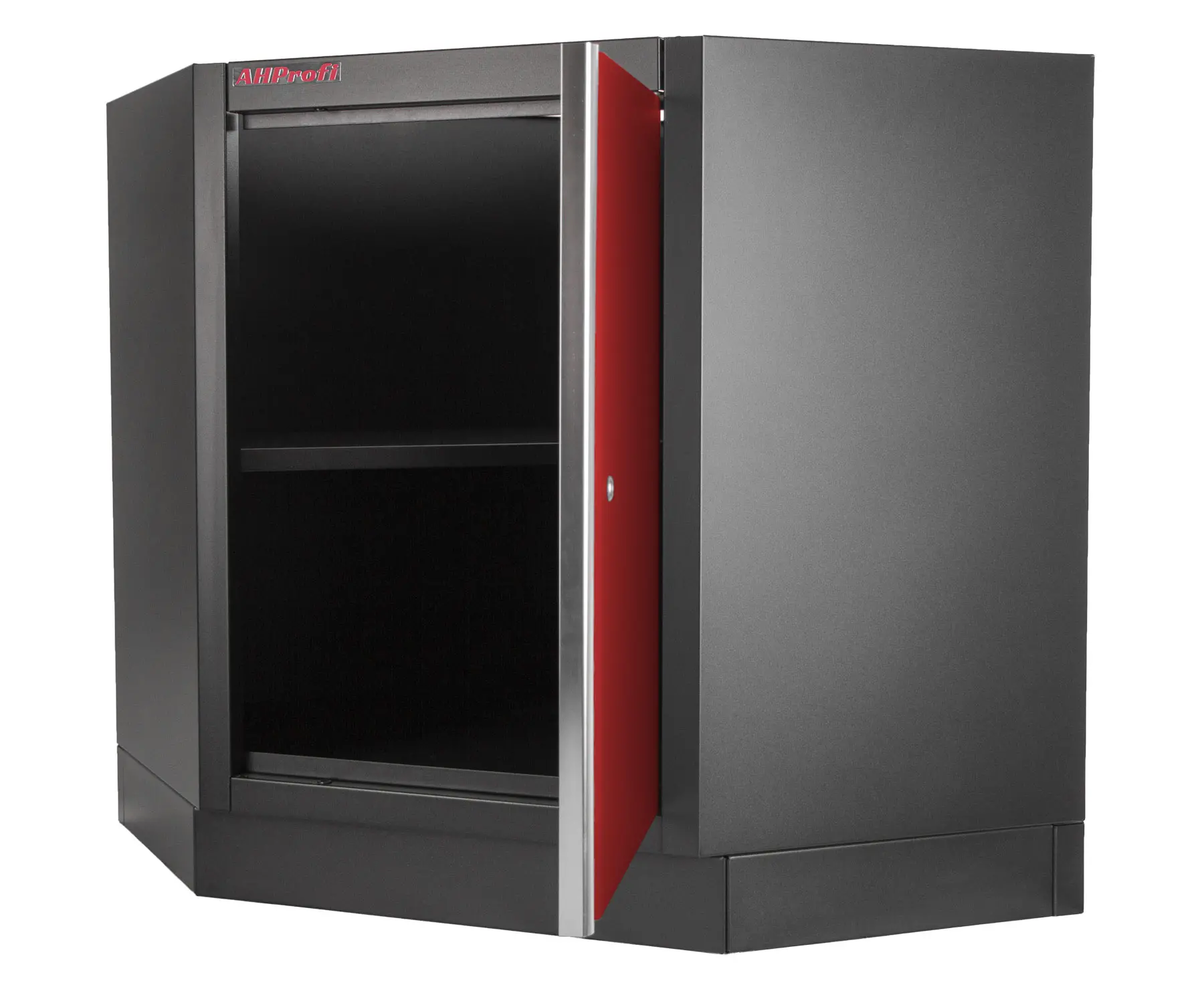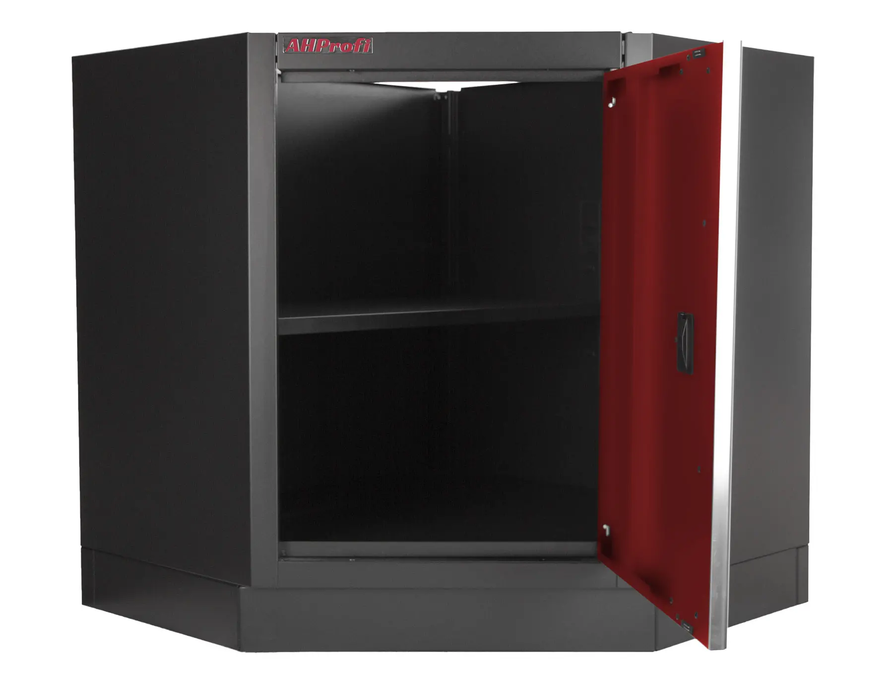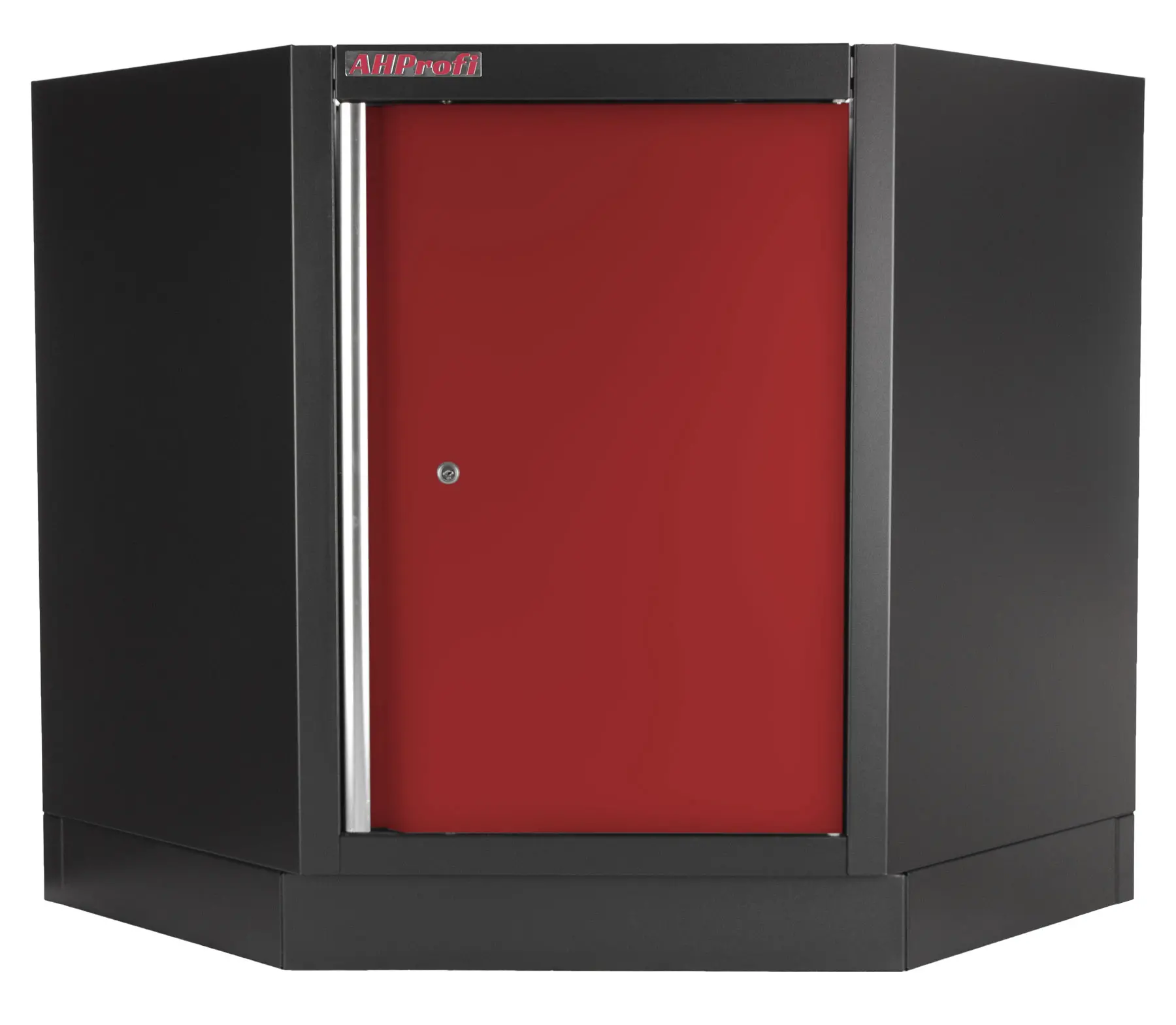 Celokovová rohová PROFI RED dielenská jednokrídlová skrinka. Skrinka je vhodná do profesionálnych servisov, dielní, ale aj do garáží na uskladnenie širokého sortimentu tovaru i ručného náradia, na ktoré sa potom nepráši a ľahšie sa udrží prehľadne upratané na správnom mieste. Táto skrinka a prípadne celá rohová zostava Vám dáva možnosť maximálne využiť priestor v garáži, domácej dielni aj profi dielni a navyše parádne vyzerá.