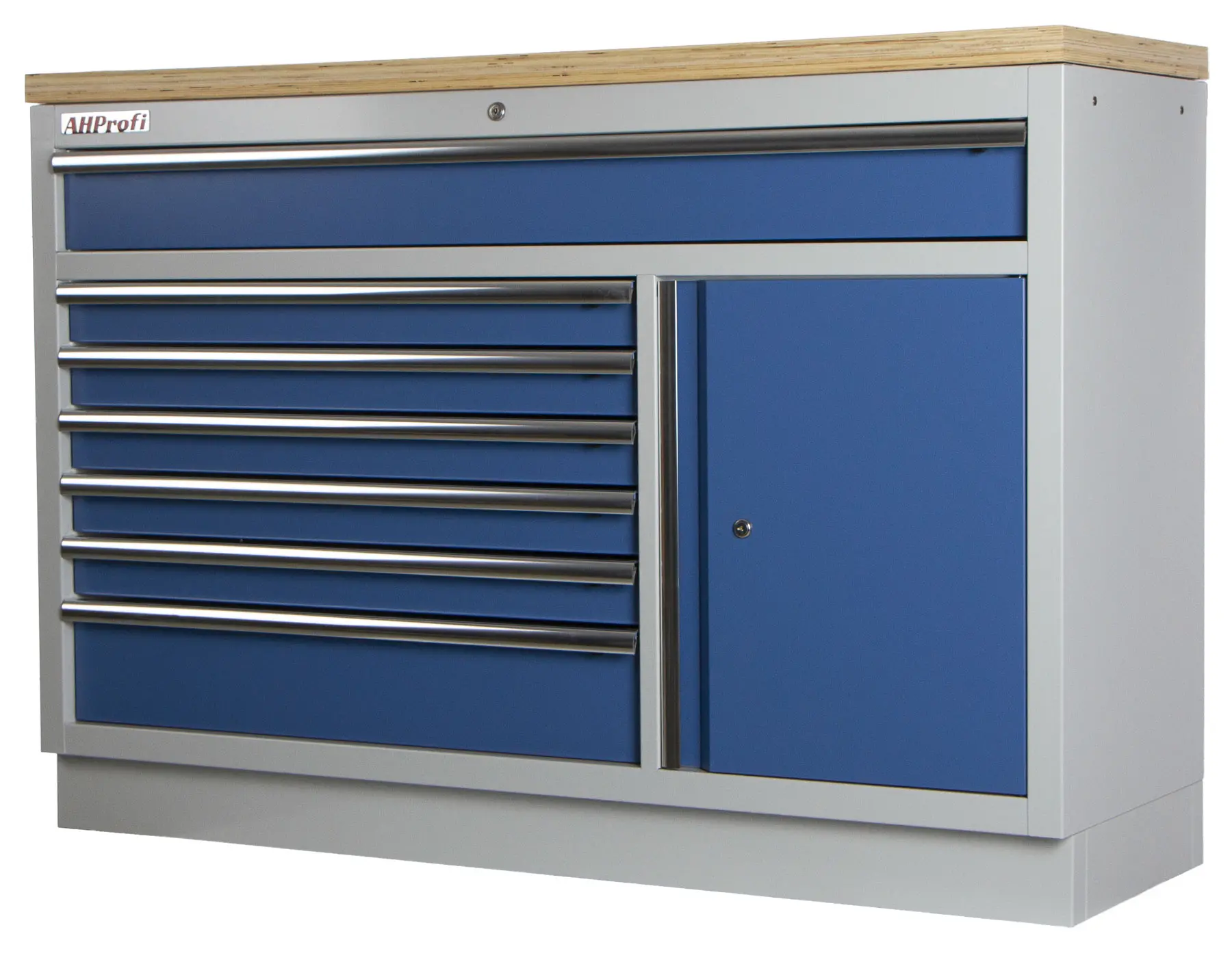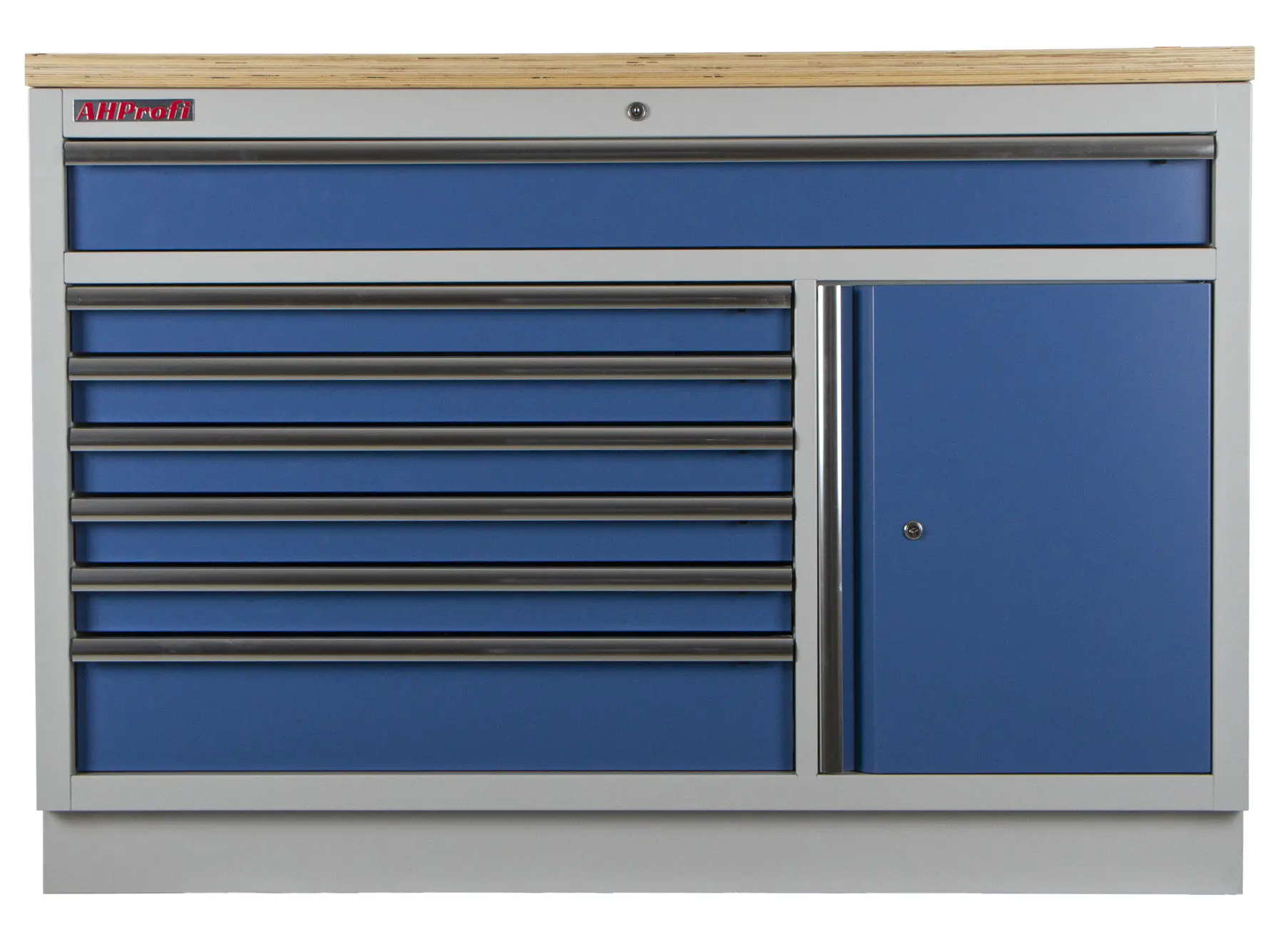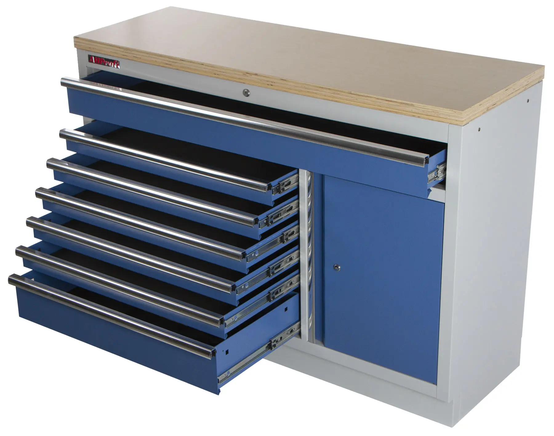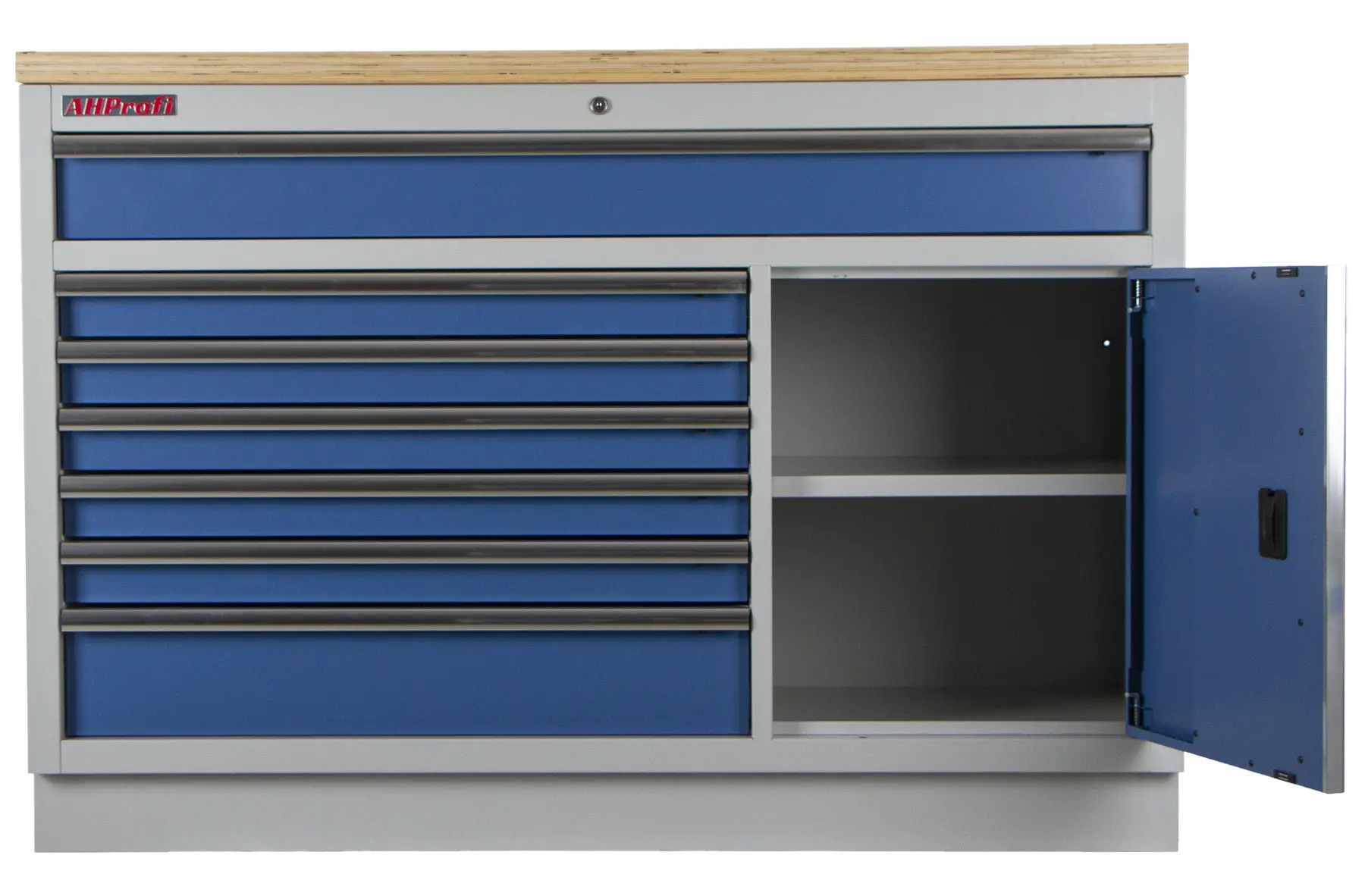 Široká celokovová dielenská skrinka so 7 zásuvkami, skrinkou a drevenou pracovnou doskou.