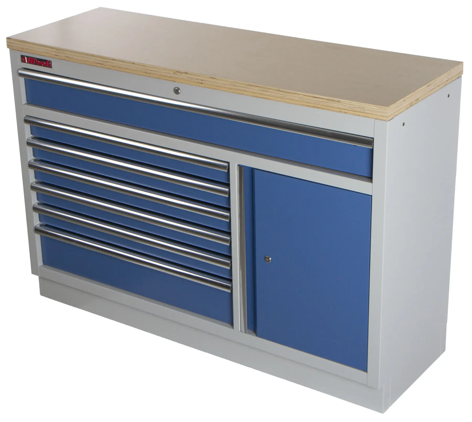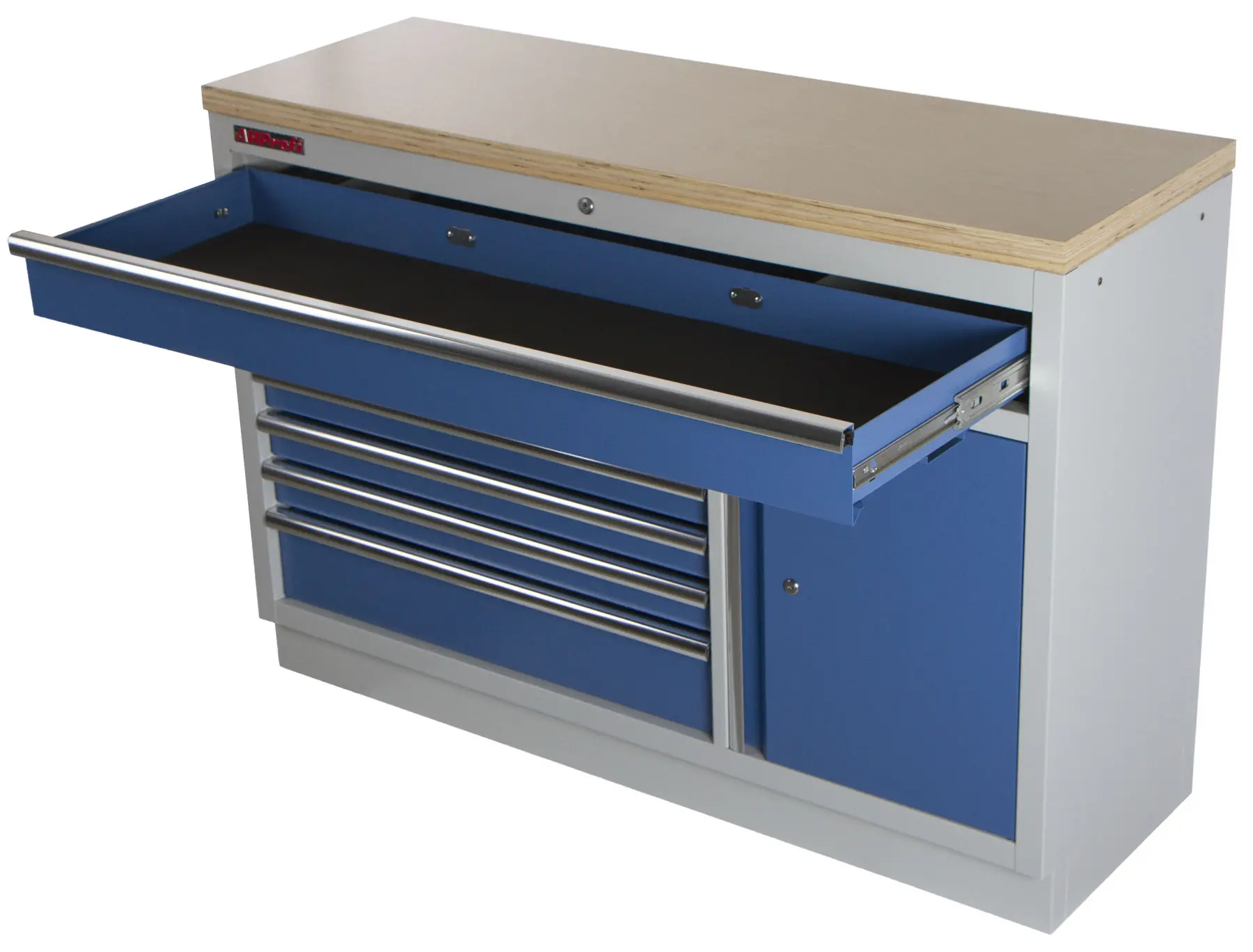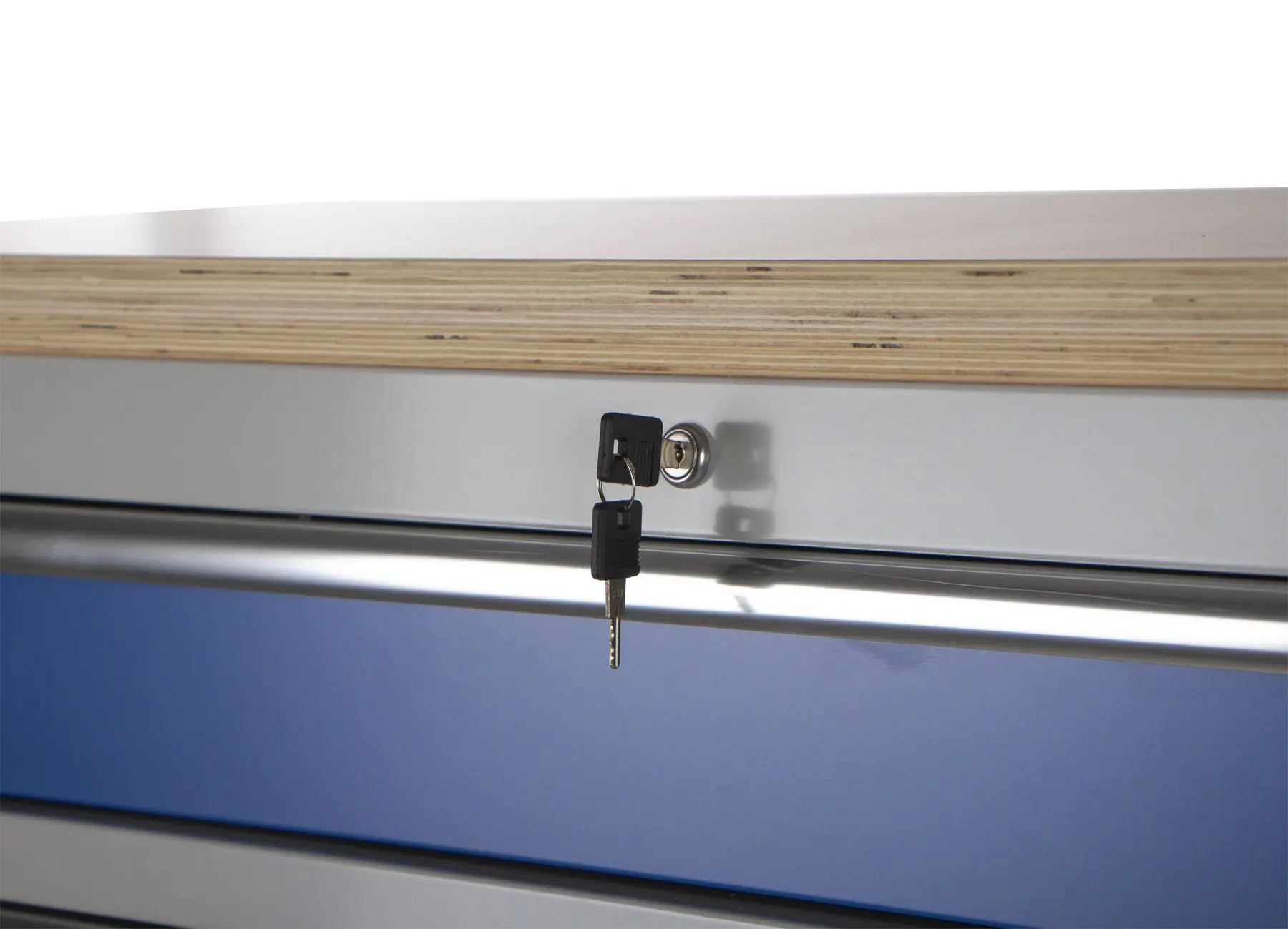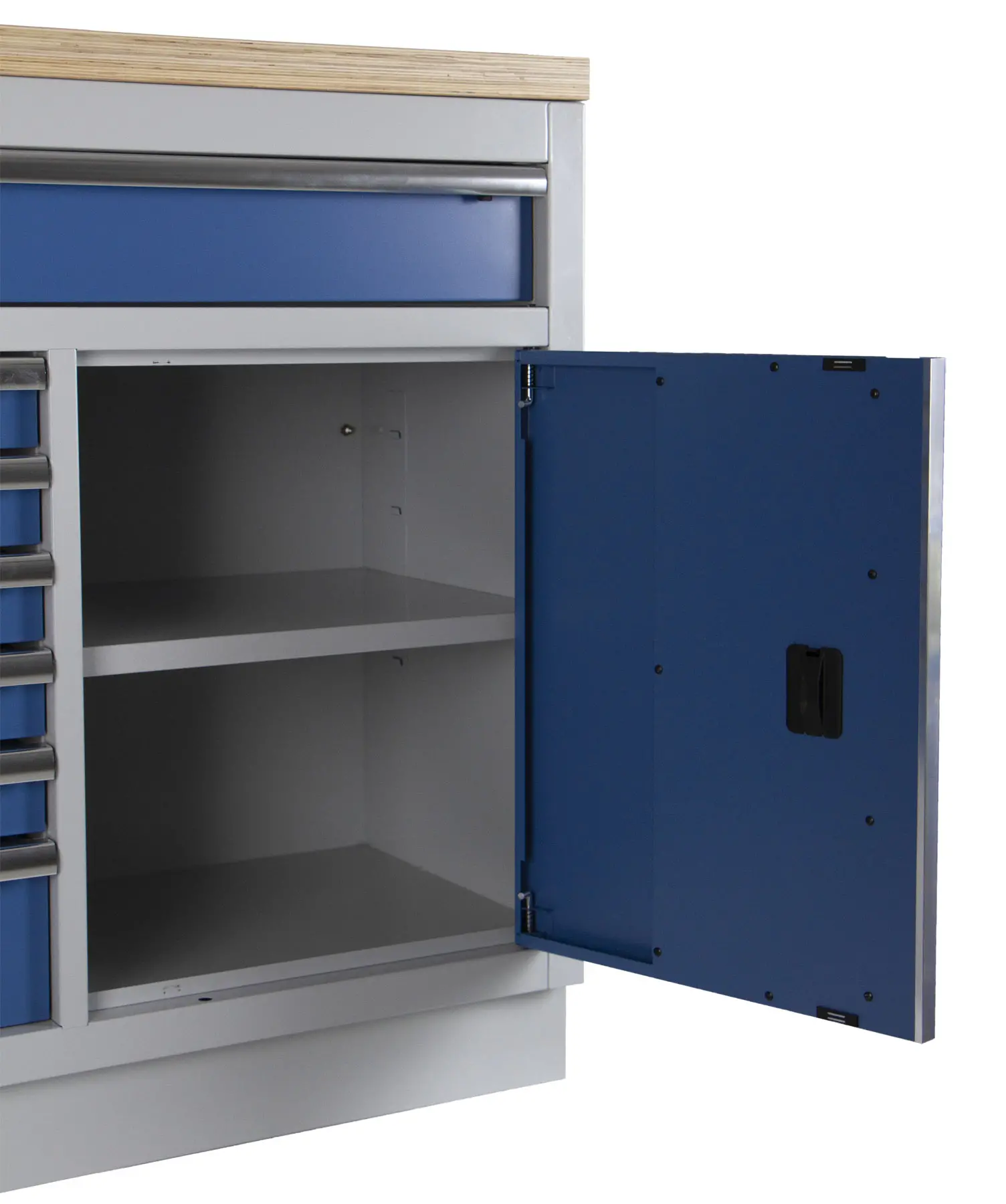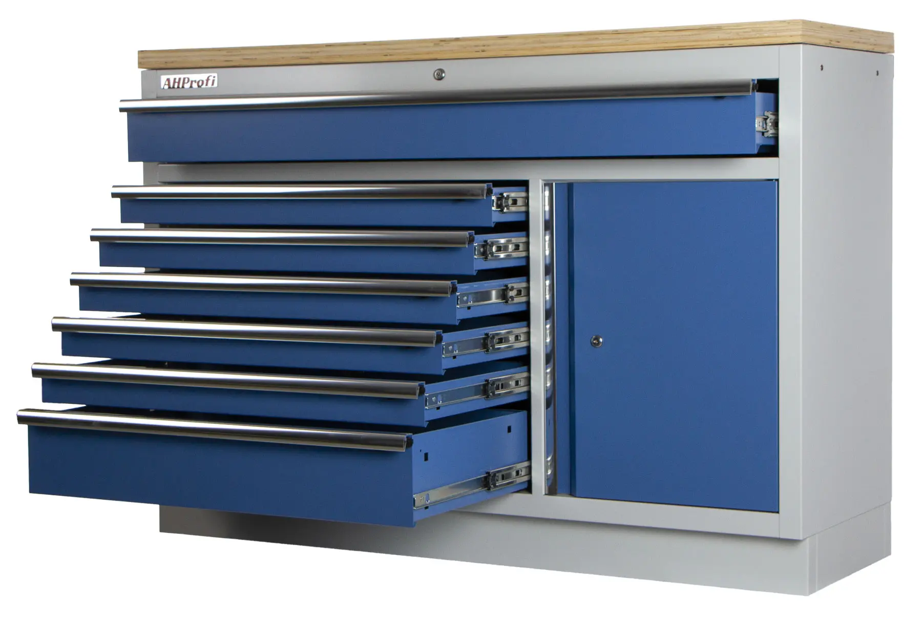 Široká celokovová dielenská skrinka so 7 zásuvkami, skrinkou a drevenou pracovnou doskou.