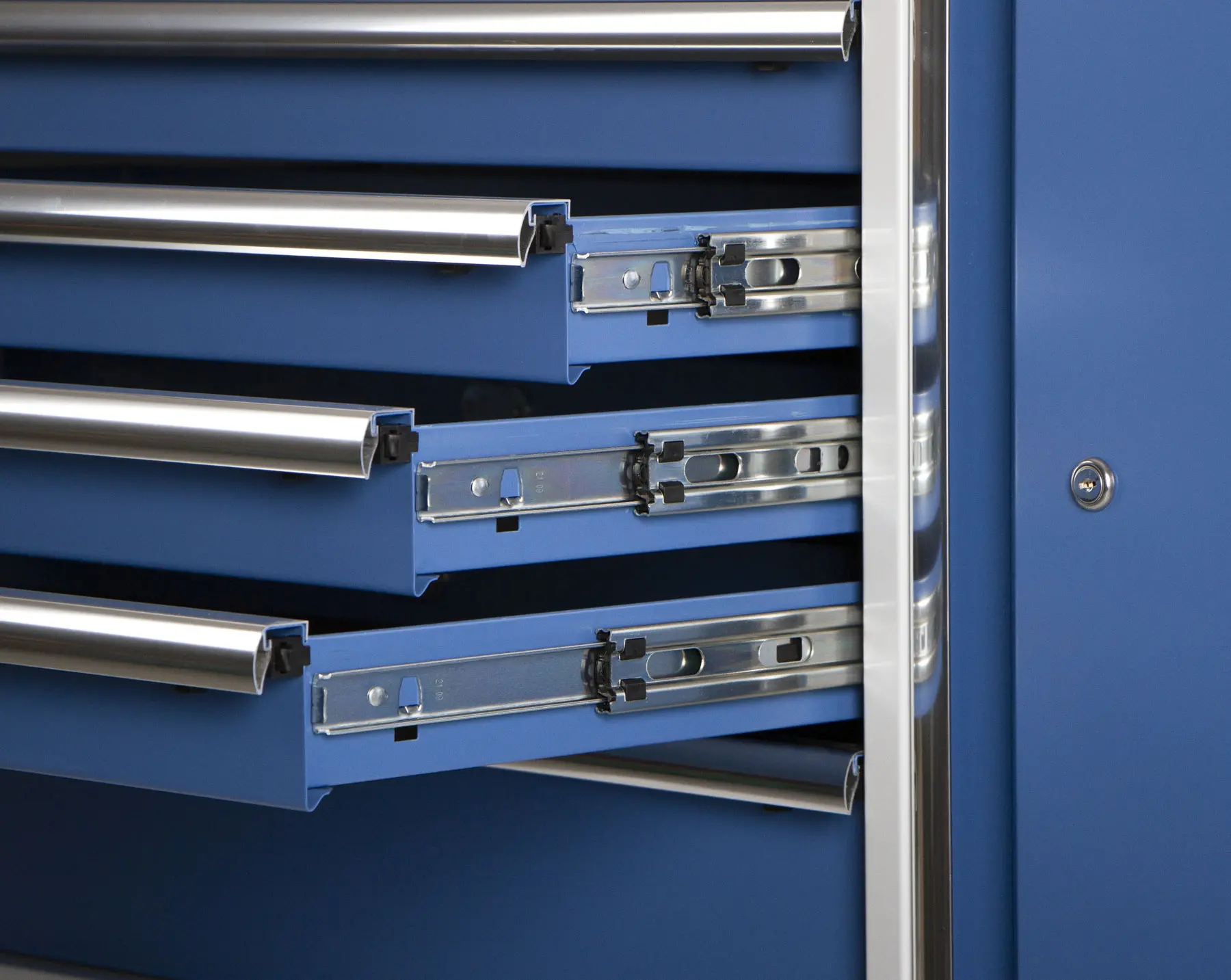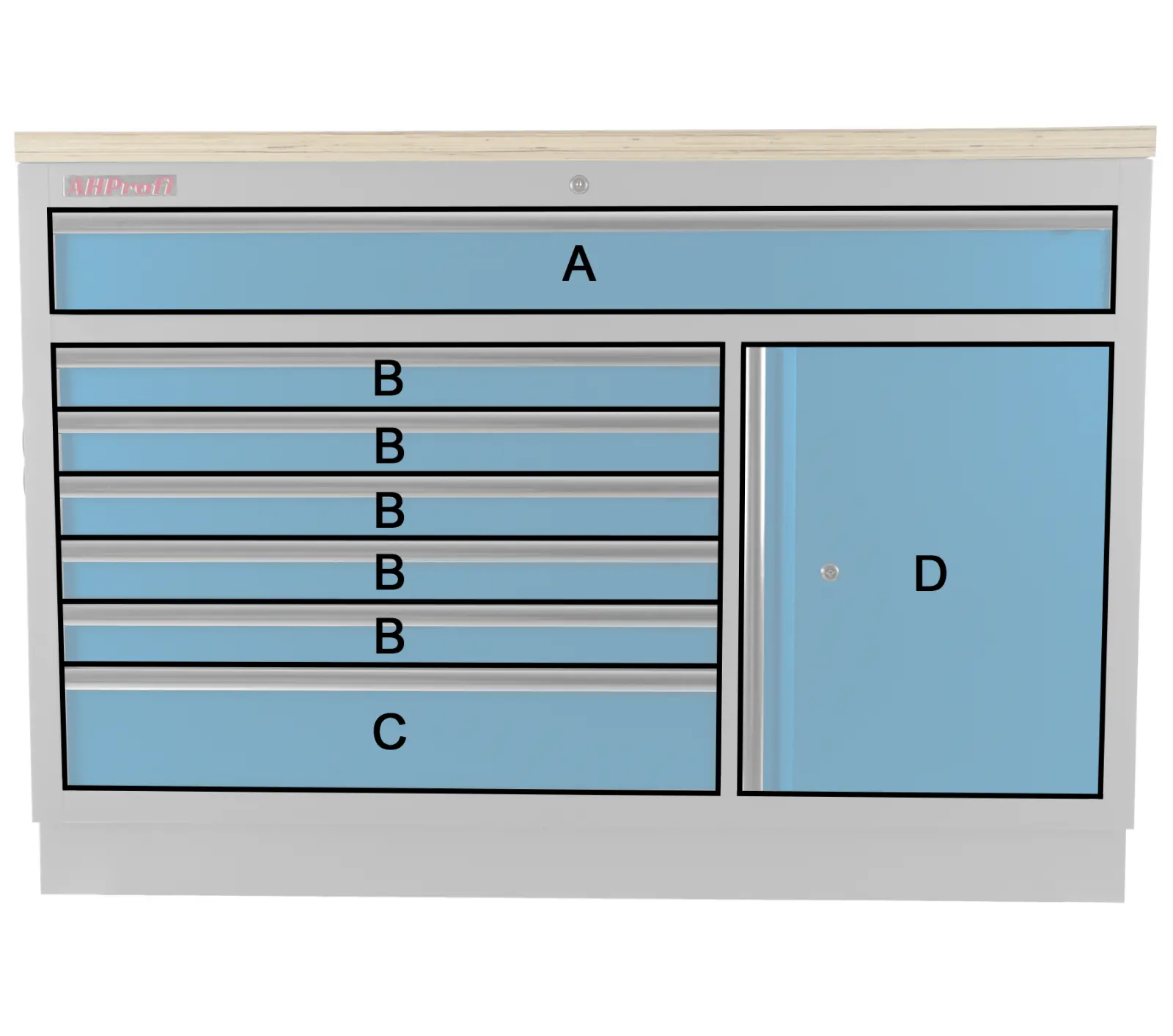 Na ľavej strane je celkom 6 zásuviek, ktoré sa hodia najmä na ručné náradie alebo výplne s náradím, do spodnej hlbšej zásuvky je možné uskladniť aj väčšie náradie.