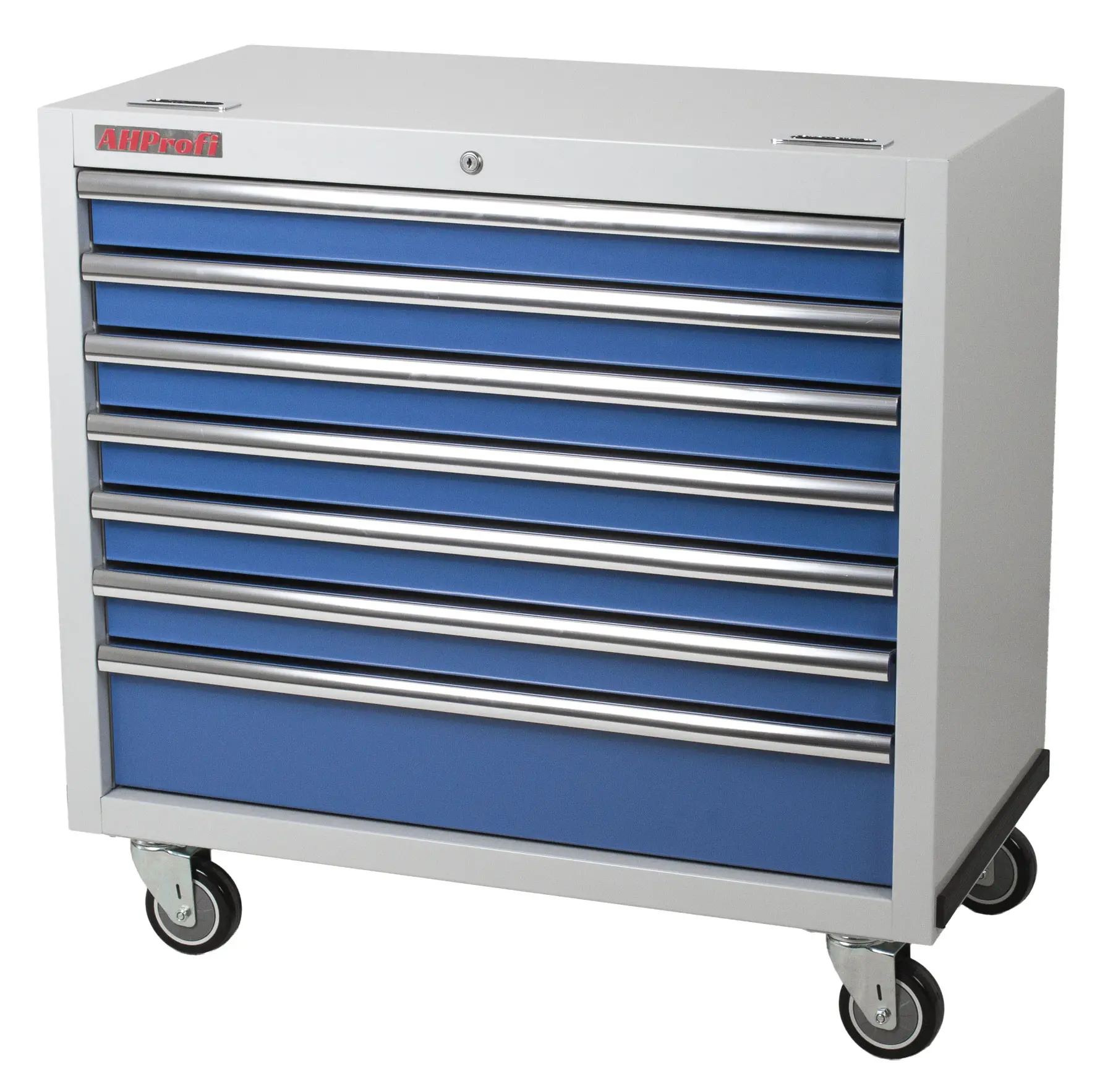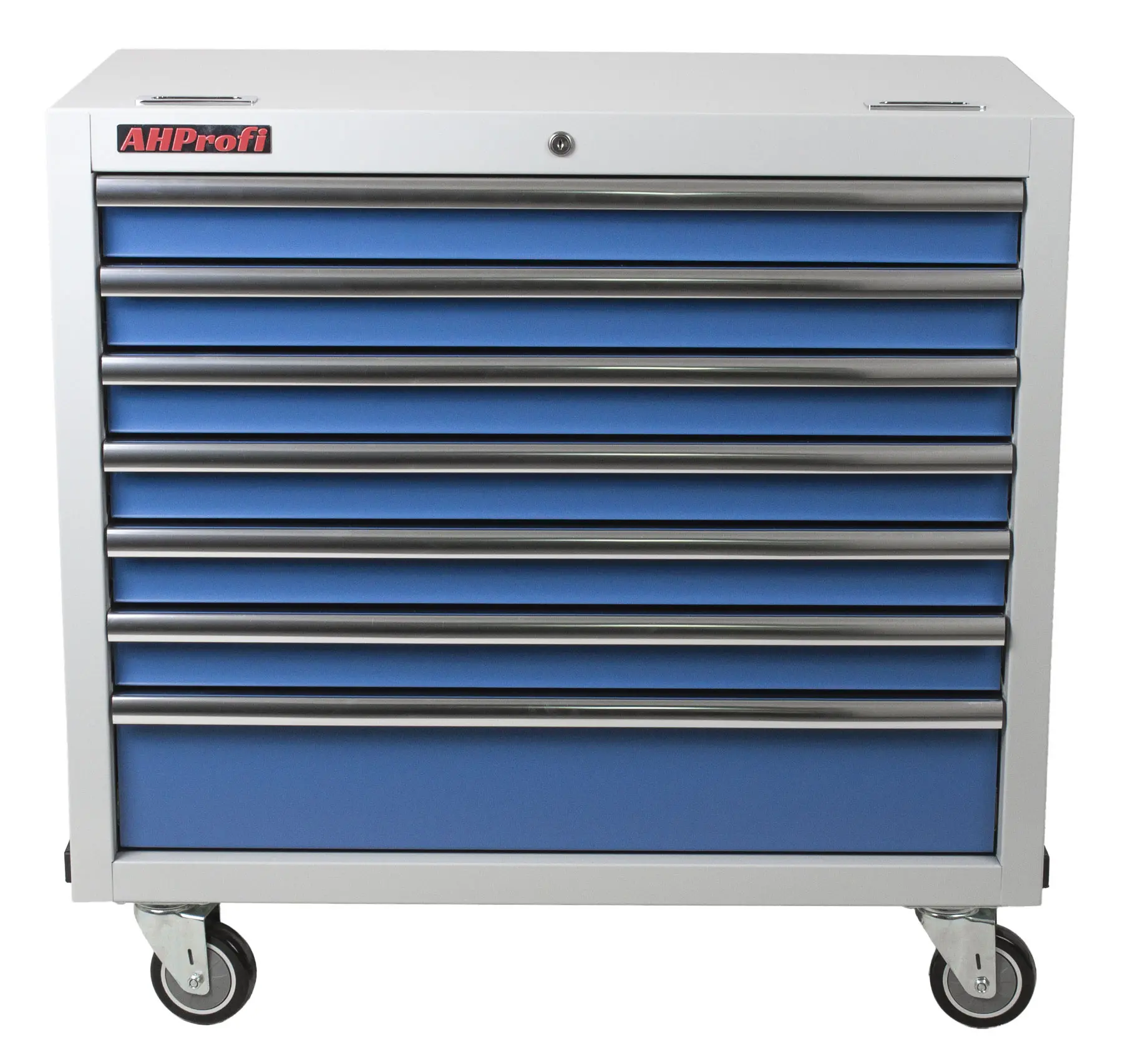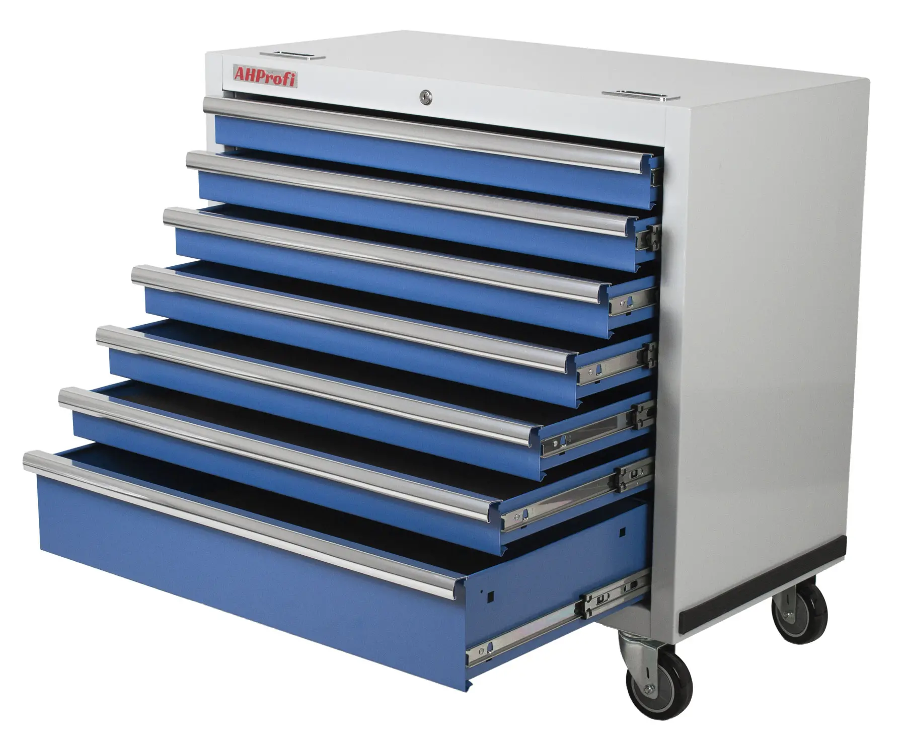Celokovový dielenský vozík o rozmeroch 895 x 458 x 860 mm, 7 uzamykateľných zásuviek.