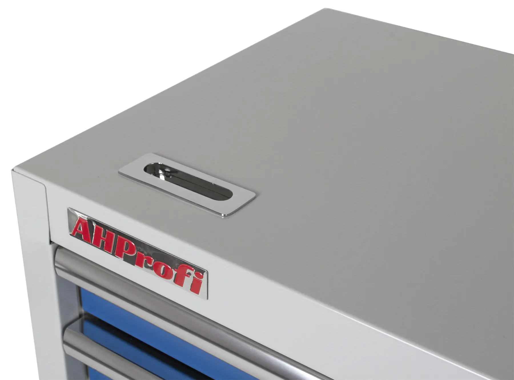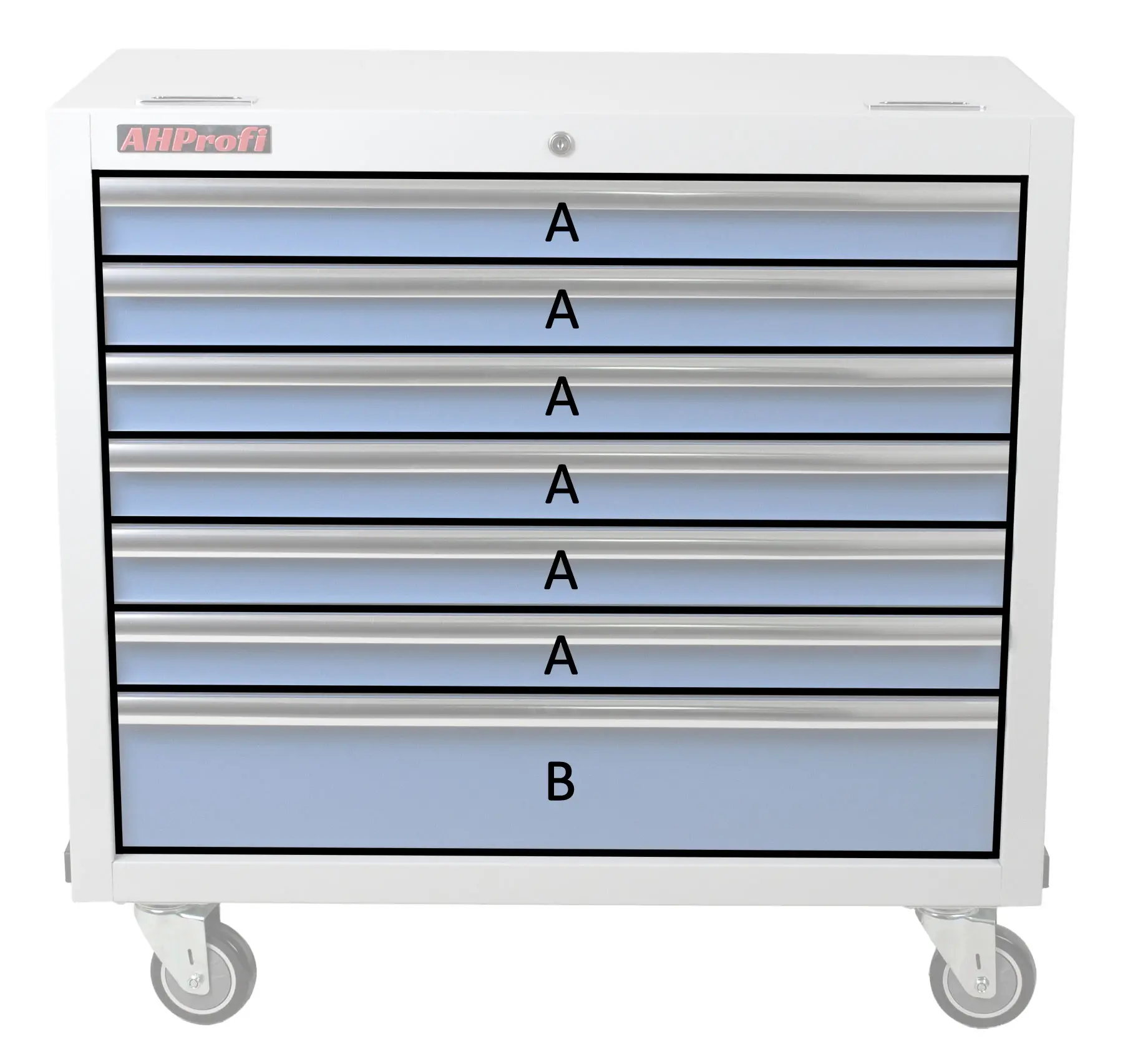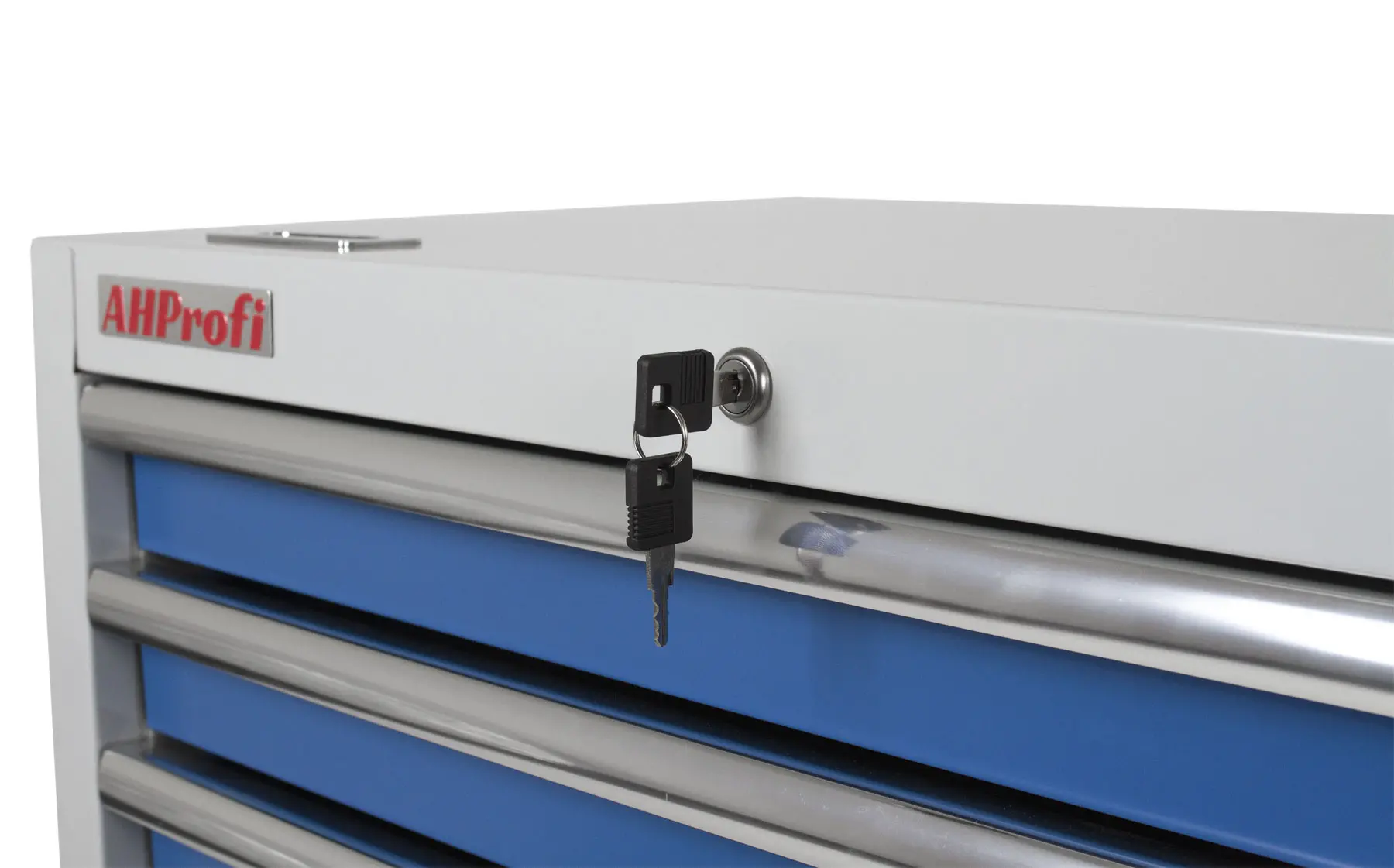 Celokovový dielenský vozík o rozmeroch 895 x 458 x 860 mm, 7 uzamykateľných zásuviek.