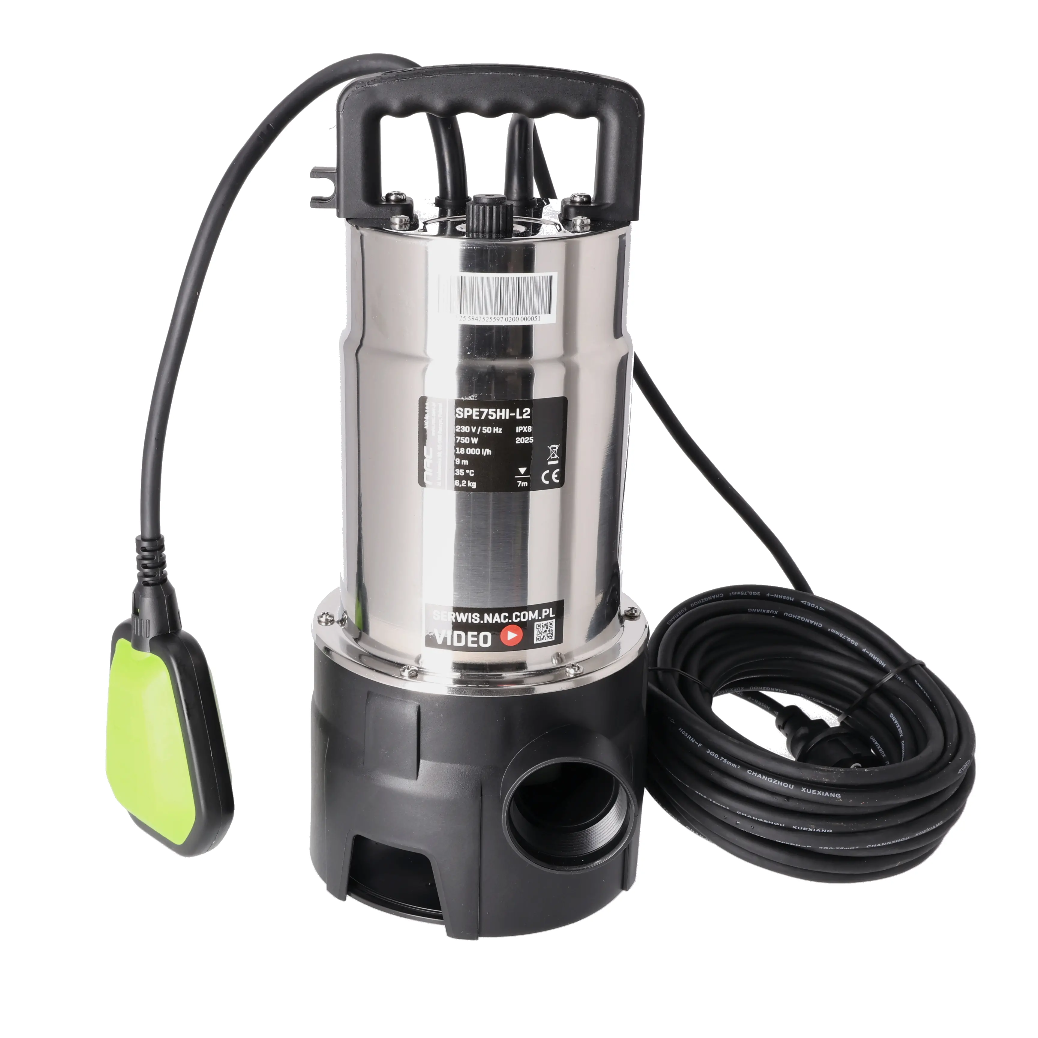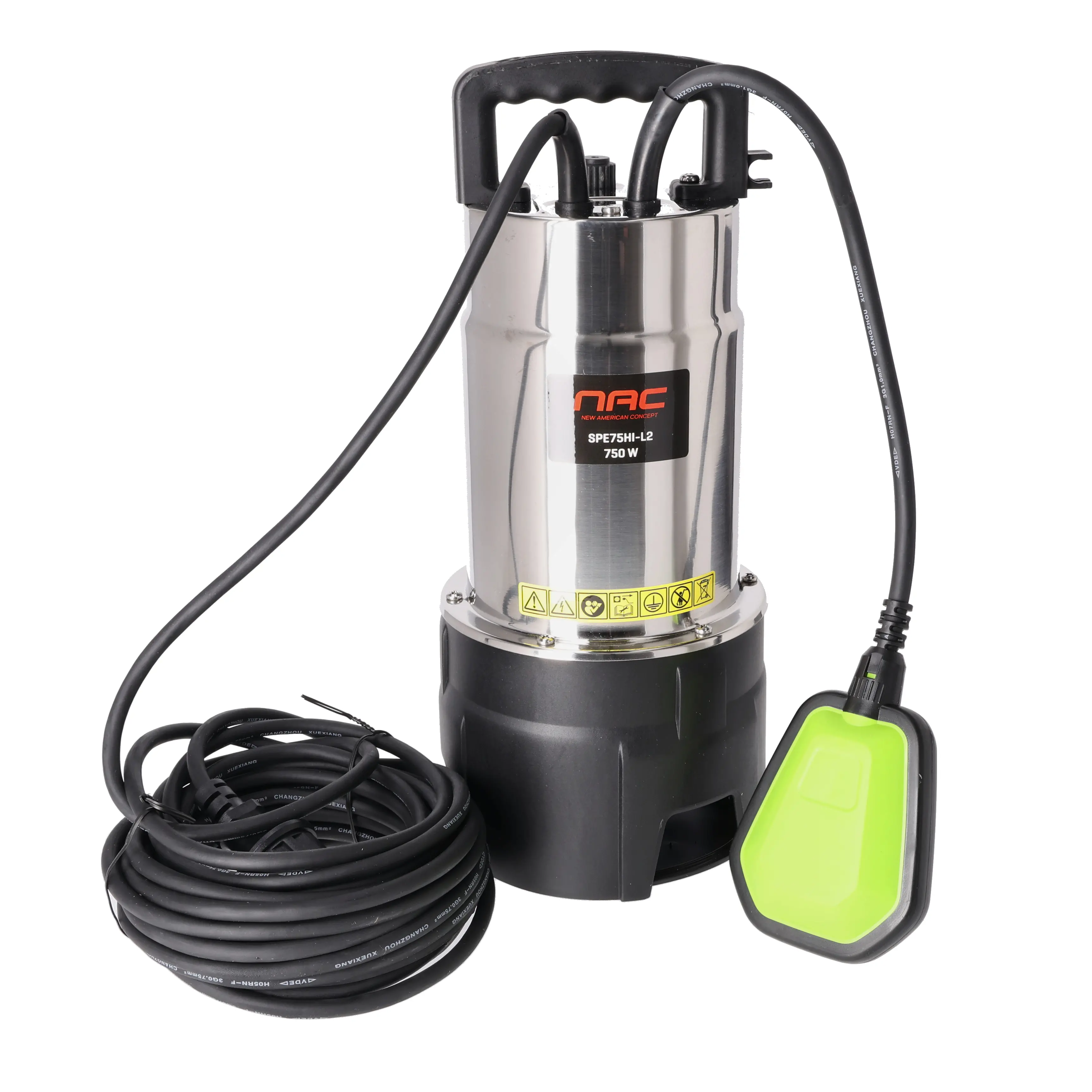 Čerpadlo NAC SPE75HI-L2 je vybavené nerezovým krytom, ktorý chráni motor aj vnútorné komponenty. Vďaka prietoku až 15 000 l/h a príkonu 750 W odčerpáte vodu rýchlo a bez námahy. Bezpečnú prevádzku zabezpečí maximálna veľkosť pevných častíc 35 mm, hĺbka ponoru 7 m a výtlak až 9 m. Vďaka 10 m dlhému káblu čerpadlo jednoducho umiestnite aj do ťažšie prístupných priestorov. Robustná konštrukcia je vhodná aj do náročnejších podmienok, kde bežné čerpadlá zlyhávajú.