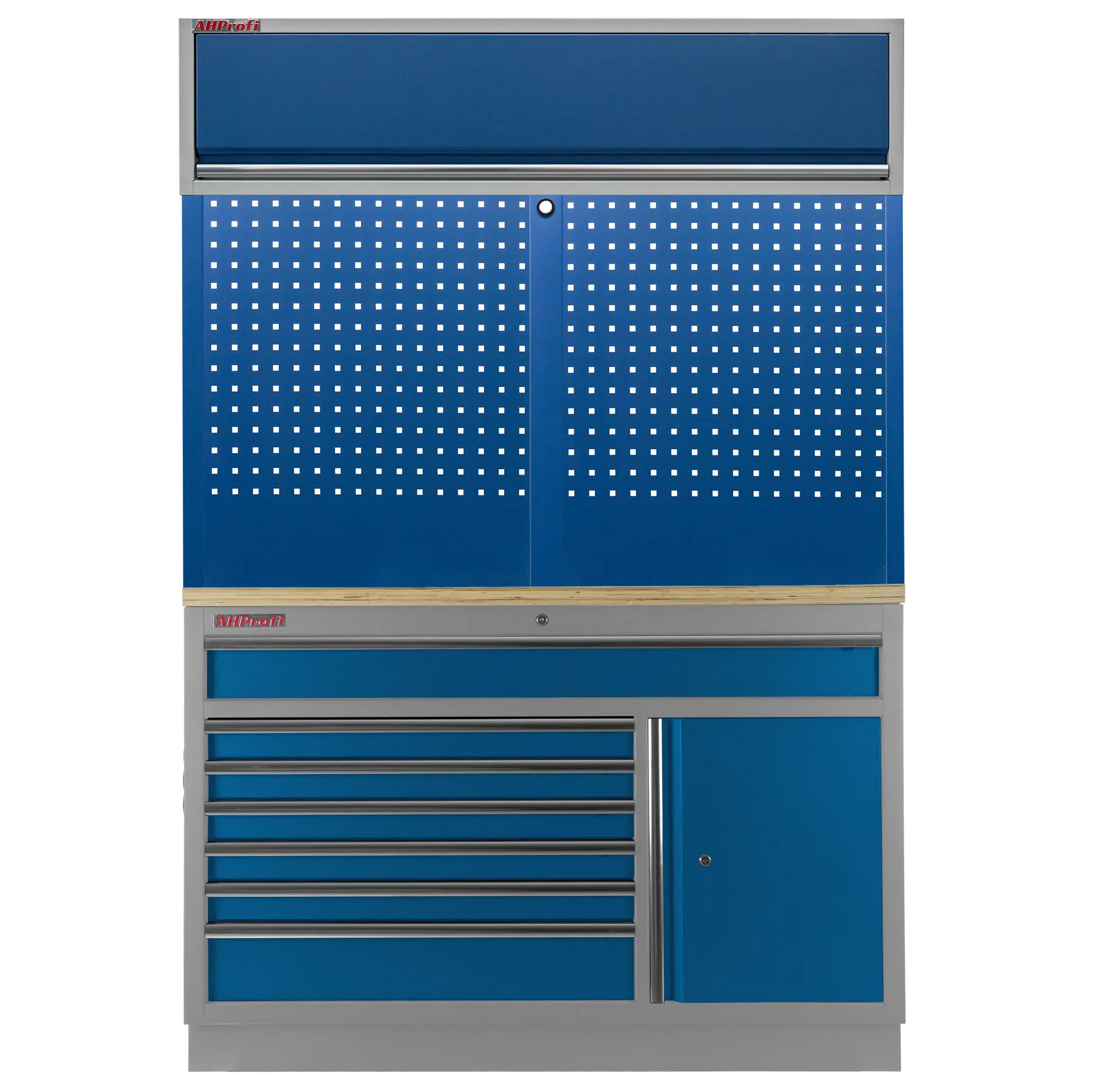 Dielenský nábytok PROFI BLUE s drevenou doskou zaujme moderným a profesionálnym vzhľadom. Kombinácia modrej RAL 5023 a šedej RAL 7035 sa bude vynímať v každej garáži aj dielni.